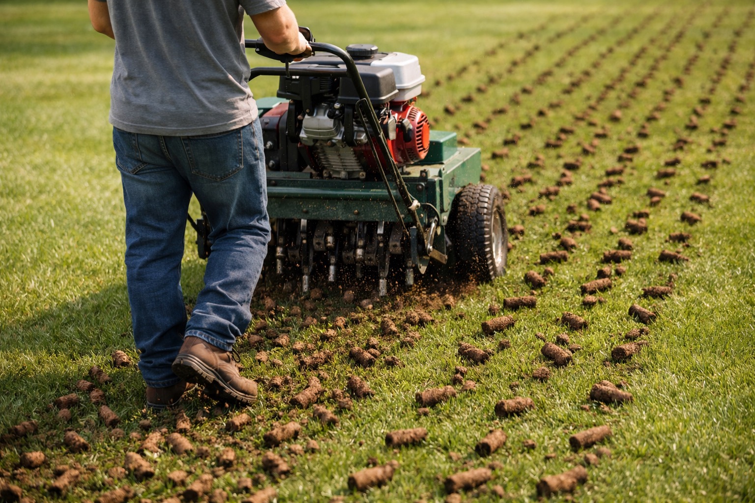 Run your sprinklers for about 30-45 minutes the evening before you plan to aerate, or time the job for a day or two after a good rain. The soil should be moist to a depth of 3-4 inches — firm enough to walk on without sinking, but soft enough that you can push a screwdriver into the ground with moderate effort. Aerating bone-dry soil is nearly impossible and damages both the machine and your lawn. Conversely, soggy mud will clog the hollow tines and create a mess rather than clean plugs.