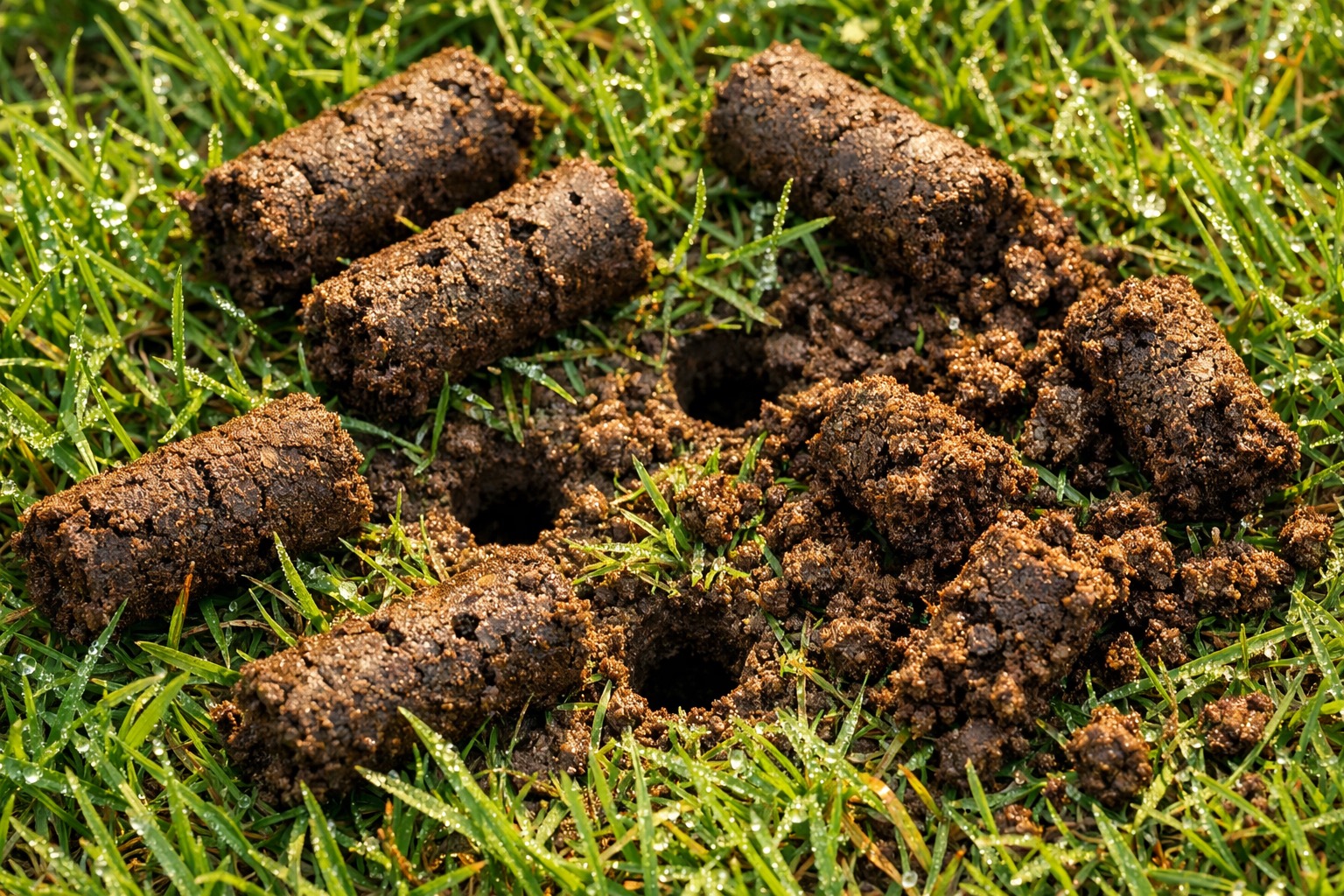 The small cylindrical soil plugs scattered across your lawn look messy, but leave them in place. They break down within 1-2 weeks (faster if you run a mower over them to crumble them) and return nutrients and beneficial microorganisms to the soil surface. The decomposing plugs also help break down thatch naturally. If the plugs bother you aesthetically, run the back of a leaf rake lightly over the lawn to break them up — but never bag and remove them.