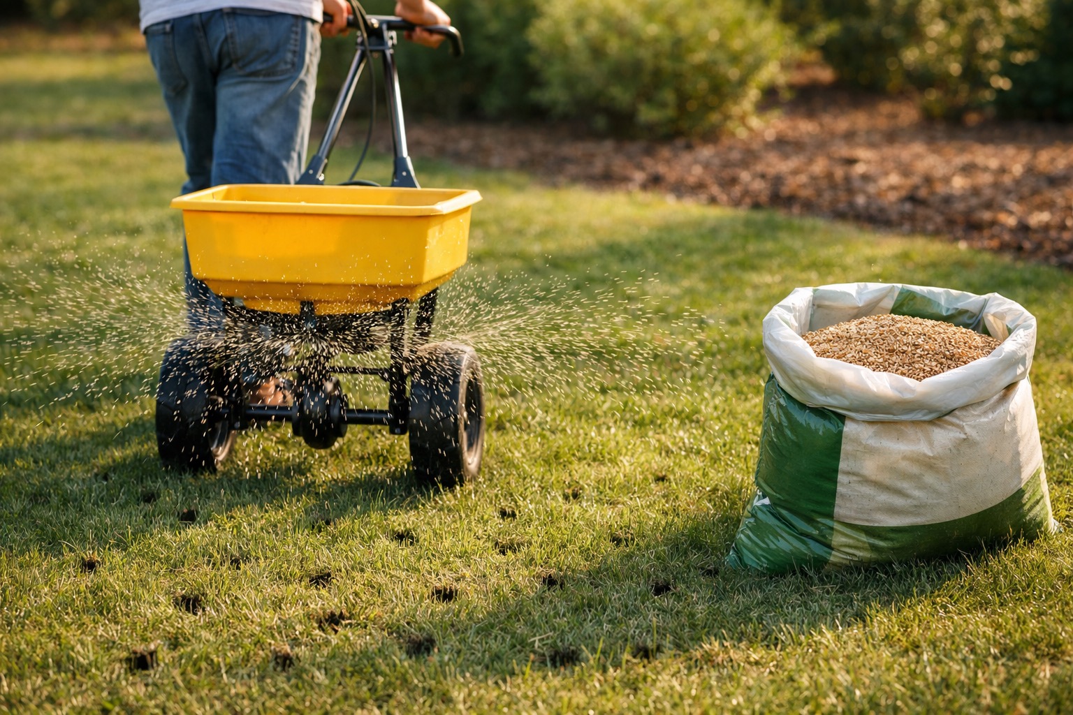 Load your broadcast spreader with grass seed at the overseeding rate on the bag — typically 3-4 pounds per 1,000 square feet (half the rate used for new lawns). Apply half the seed walking in one direction (north-south), then apply the remaining half walking perpendicular (east-west). This crosshatch pattern ensures even coverage with no bare streaks. The seed will fall naturally into the aeration holes where it has perfect soil contact, moisture, and protection from birds. For bare patches larger than 6 inches across, apply seed at the full new-lawn rate.