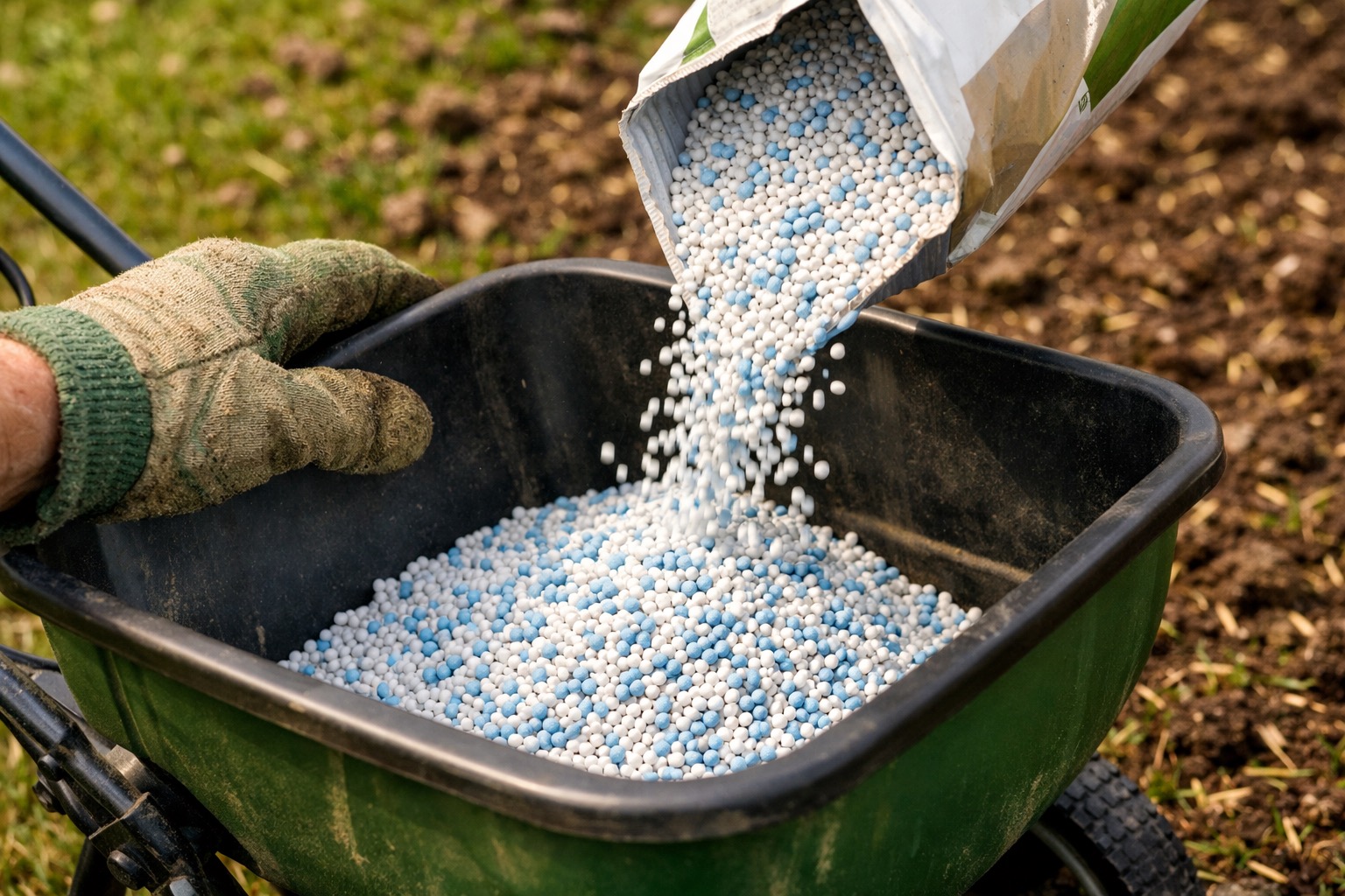 Immediately after seeding, apply a starter fertilizer with a high middle number (phosphorus) — something like 10-18-10 or a product labeled specifically as "starter fertilizer." Phosphorus promotes root development in new seedlings, which is critical during the first 4-6 weeks. Use your broadcast spreader at the rate listed on the fertilizer bag. Do not apply weed-and-feed or any product containing pre-emergent herbicide — these chemicals prevent all seeds from germinating, including your new grass seed.