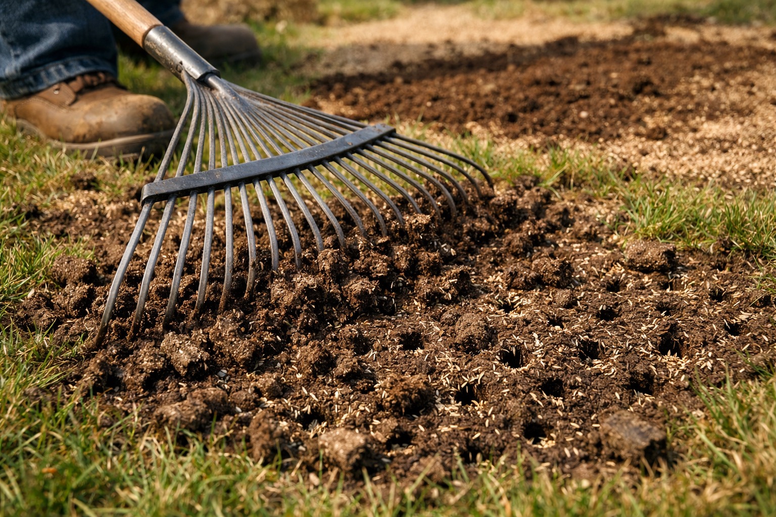 Use the back of a leaf rake or a flexible tine rake to gently drag across the lawn surface. This works loose seed down into the aeration holes and scratches it into the top 1/4 inch of soil between the holes. Don't rake aggressively — you're not trying to move soil, just nudge the seed into contact with it. For bare or thin patches, spread a thin layer (1/4 inch) of peat moss, compost, or topsoil over the seed to hold moisture and protect against birds. Straw mulch works too — one bale covers roughly 1,000 square feet at the right thickness.