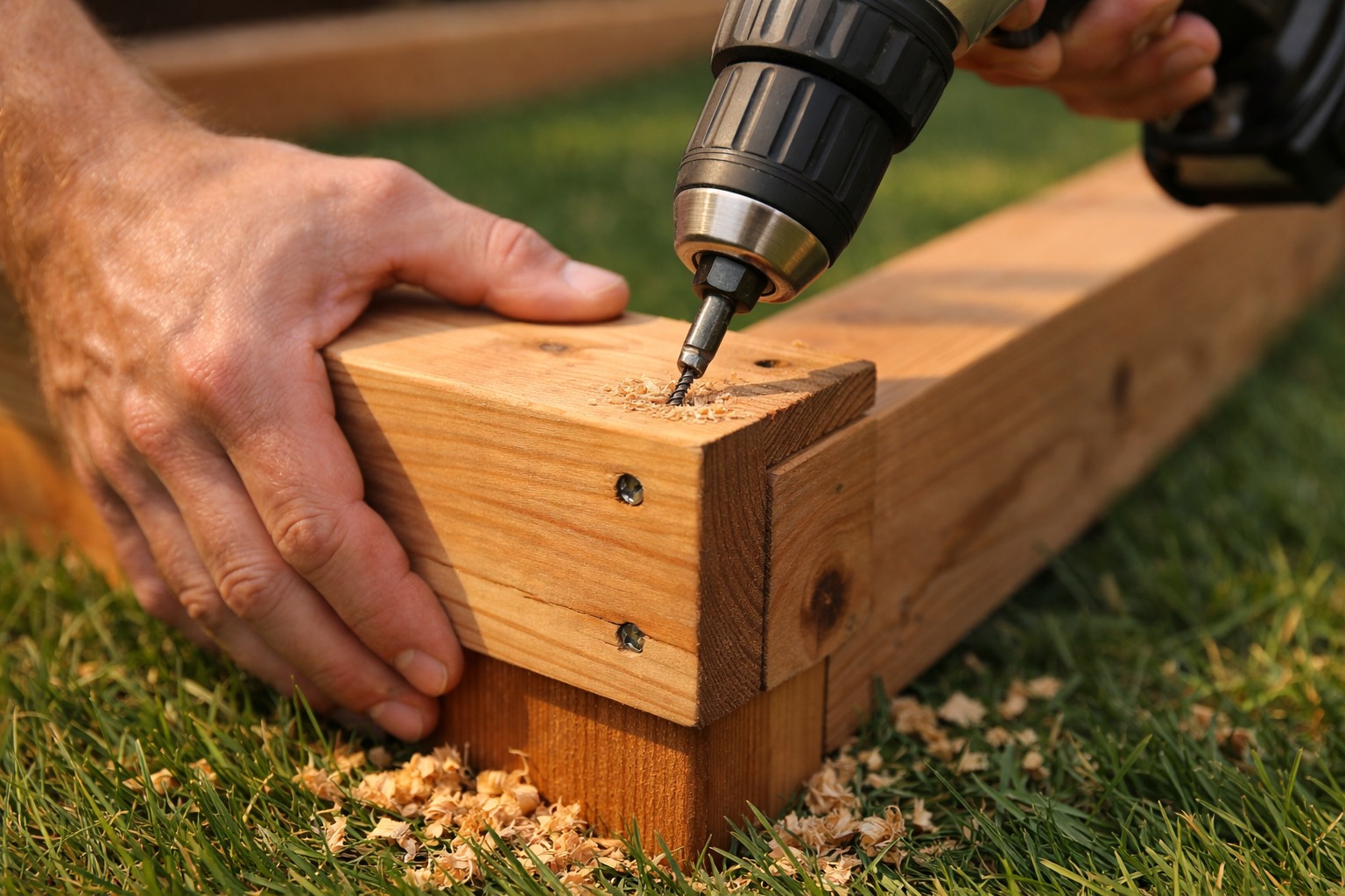 Stand a 4x4 corner post inside one corner, flush with the top edge of a long board. Pre-drill two pilot holes through the 2x6 into the post to prevent splitting, then drive two 3-inch deck screws through the board into the post. Attach a short (4-foot) board to the same corner post the same way — pre-drill, then screw. Continue around the rectangle, attaching boards to corner posts until you have a complete 4x8 frame. Check that the frame is square by measuring diagonals — they should be equal (within 1/4 inch).