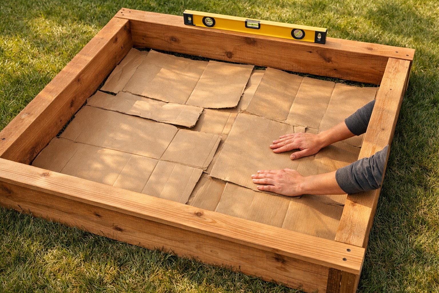 Place the assembled frame in its final position and use a level across the top edges to check that it sits evenly. If the ground slopes, dig down on the high side until the frame is level — this prevents soil and water from shifting to one end. You don't need to remove the grass underneath. Lay cardboard or landscape fabric inside the bed footprint directly over the grass — it will smother the existing vegetation and decompose over a few months. Overlap cardboard pieces by 4-6 inches so weeds can't find gaps.