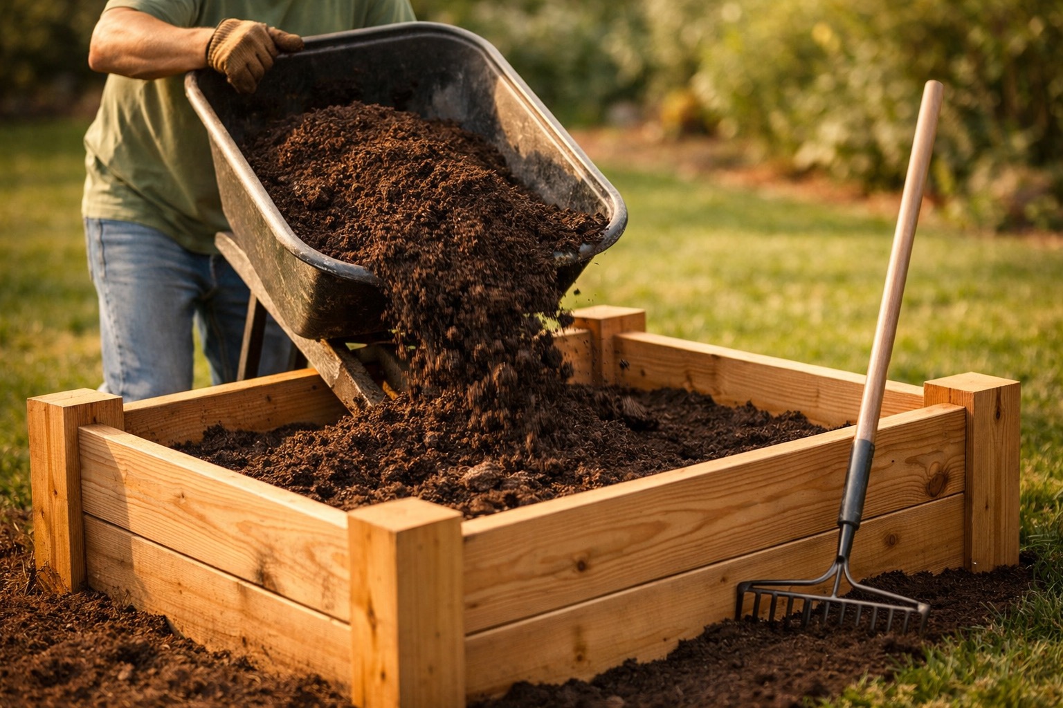 A 4x8-foot bed that's 12 inches deep requires approximately 1 cubic yard of soil (about 27 cubic feet). Use a mix of 60% topsoil, 30% compost, and 10% coarse vermiculite or perlite for drainage — this is sometimes sold pre-mixed as "raised bed mix." Dump the soil into the bed with a wheelbarrow and spread it evenly with a garden rake. Fill to within 1 inch of the top to leave room for mulch. Water the soil thoroughly after filling — it will settle 1-2 inches over the first week, so top off as needed.