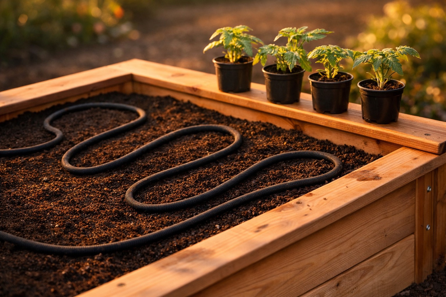 Rake the soil surface smooth and level. If you plan to install drip irrigation or a soaker hose, lay it on the soil surface now before planting — a simple soaker hose on a timer ($20-30) saves hours of hand-watering. Add 2-3 inches of mulch (straw, wood chips, or shredded leaves) around plants after planting to retain moisture and suppress weeds. Optionally, screw a flat 1x4 or 1x6 cedar board along the top edge as a cap rail — this creates a comfortable ledge to sit on while weeding and gives the bed a polished look.