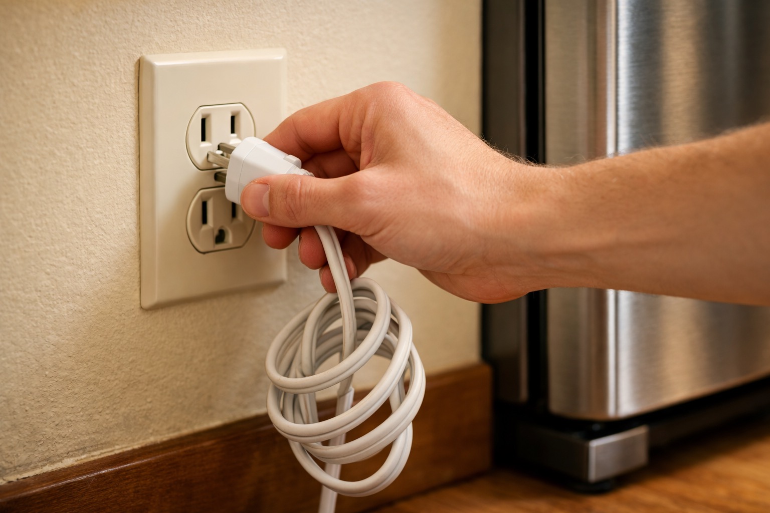 Pull the refrigerator's power cord from the wall outlet, or switch off the dedicated circuit breaker if the outlet is inaccessible behind the unit. This is non-negotiable — the condenser fan sits right next to the coils and will spin on unexpectedly during cleaning, risking finger injury and pulling loose debris deeper into the unit. Wait about 30 seconds after unplugging to let the compressor and fan fully stop before proceeding.