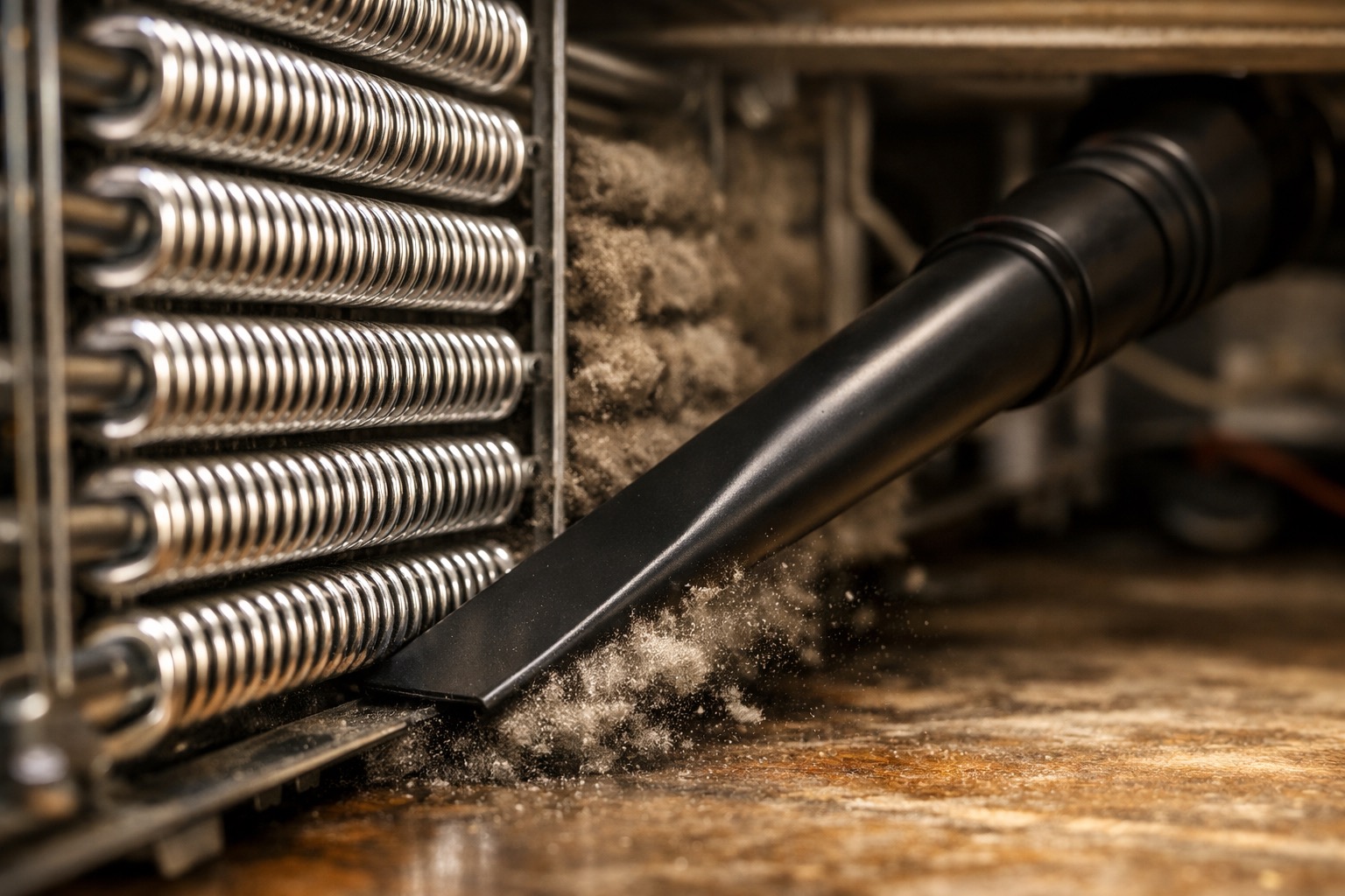 Attach the crevice tool or brush attachment to your vacuum and thoroughly vacuum all the dust and debris you just loosened from the coils. Work the crevice attachment between the coils, around the condenser fan blades, and along the floor area beneath the unit. Pay special attention to the corners where dust bunnies accumulate. For rear-mount coils, vacuum the entire back surface and the area where the coils meet the refrigerator body. You should be able to see clean, shiny coil tubing and fins when you're done.