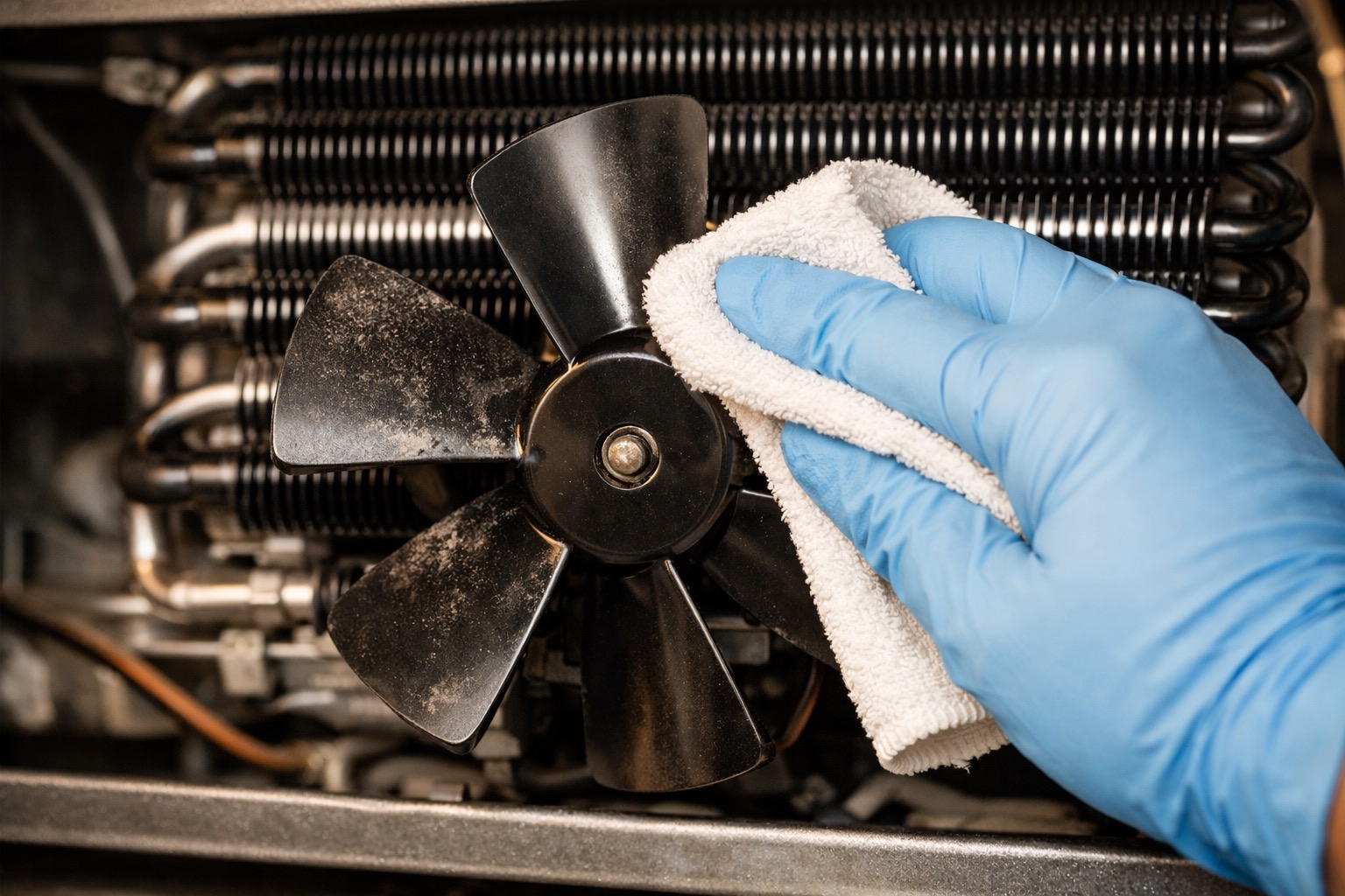 While you have access to the coil area, locate the condenser fan — it's mounted right next to or behind the condenser coils on bottom-mount models. Dust and pet hair wrap around the fan blades over time, reducing airflow and making the fan motor work harder. Use the vacuum brush attachment to clean each blade, then wipe them with a dry microfiber cloth. Spin the fan by hand to make sure it rotates freely without catching. If the fan wobbles or doesn't spin smoothly, the motor bearing may be worn — that's a separate repair.