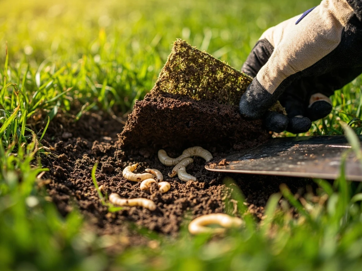 Before spending money on treatment, verify that grubs are actually the issue. Choose a brown or spongy area of your lawn and use a flat-blade spade to cut three sides of a 1-foot square, about 3 inches deep. Peel back the sod flap like a carpet and count the white, C-shaped grubs in the exposed soil. Six or fewer grubs per square foot is normal and doesn't require treatment — a healthy lawn can tolerate that level. Ten or more per square foot means you have an infestation that needs action. Check 3-4 spots across the lawn to get an accurate picture, then press the sod flap back down and water it.