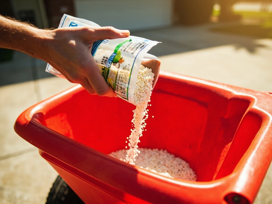 Check the product label for the recommended spreader setting and application rate — GrubEx, for example, calls for 2.87 pounds per 1,000 square feet. Set your broadcast spreader to the dial number listed on the bag for your spreader brand (Scotts, Earthway, etc.). Pour the granules into the spreader hopper on a hard surface like a driveway — never on the lawn, where a spill could burn the grass. Close the hopper gate before moving to the lawn.