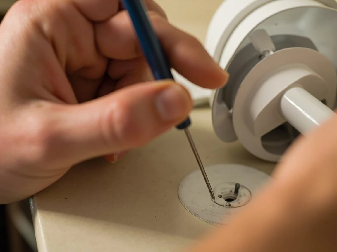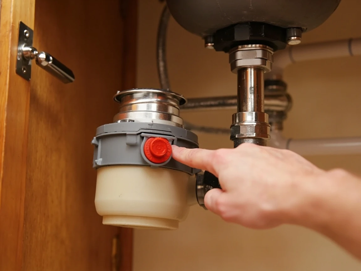 Wipe down the sink flange area with a damp cloth to remove any remaining plumber's putty residue. Locate the red reset button on the bottom of the disposal — if the unit ever jams or trips its internal breaker, you'll press this button after clearing the jam to restore power. Most disposals also include an Allen wrench that fits into a hex socket on the bottom center — if the grinding plate jams, insert the wrench and rotate it back and forth to free the obstruction. Store the Allen wrench under the sink where you can find it.