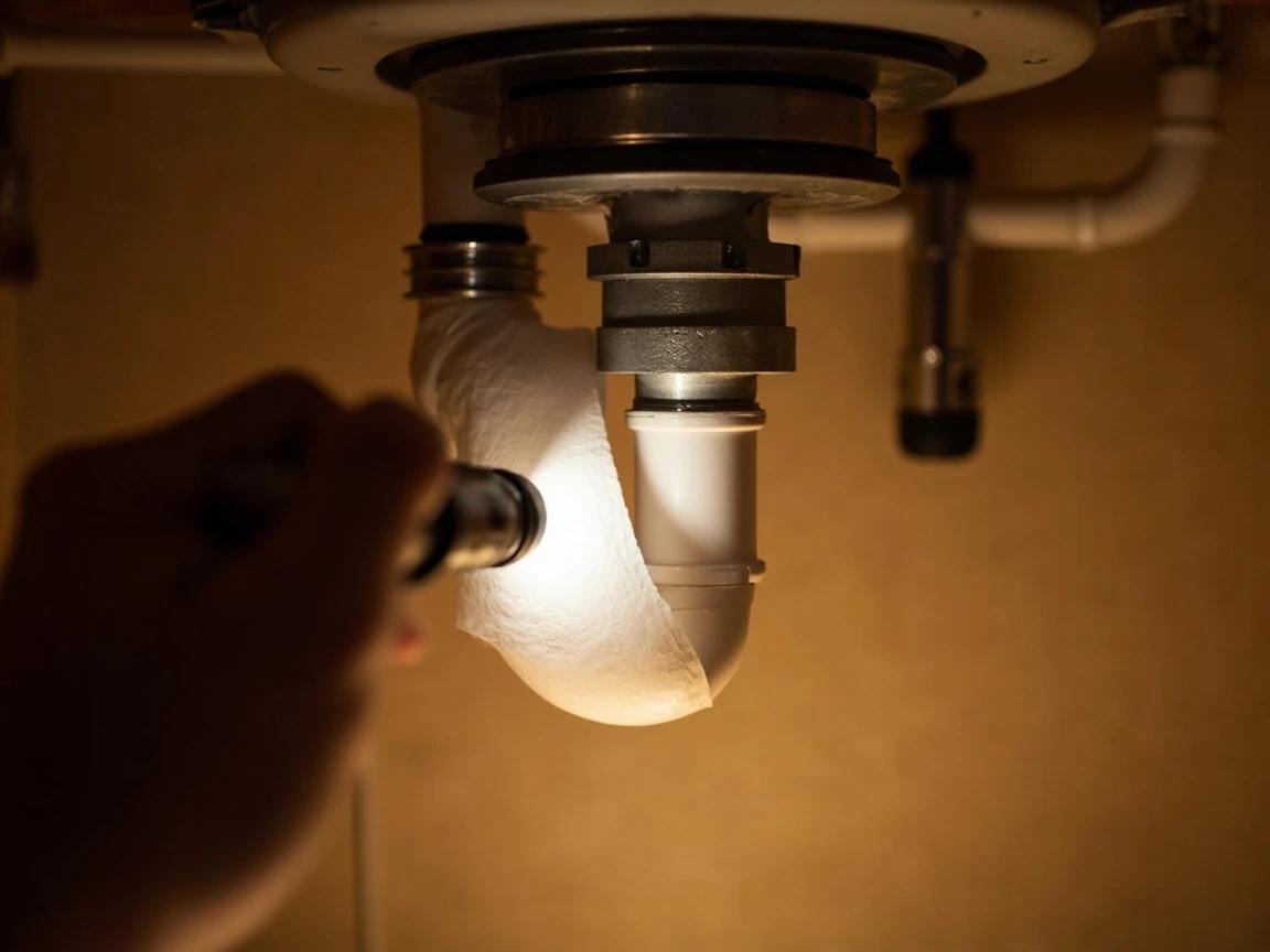 Plug the disposal into the outlet (or turn the breaker back on for hardwired units). Turn on the cold water and let it run for 30 seconds while you inspect every connection point with a flashlight: the sink flange from above, the mounting assembly, the discharge tube clamp, all P-trap slip-nut joints, and the dishwasher hose clamp. Dry each joint with a paper towel, then check again — even a tiny drip needs to be tightened now. With the water running, flip the wall switch to turn on the disposal and listen for smooth operation with no rattling or grinding sounds.