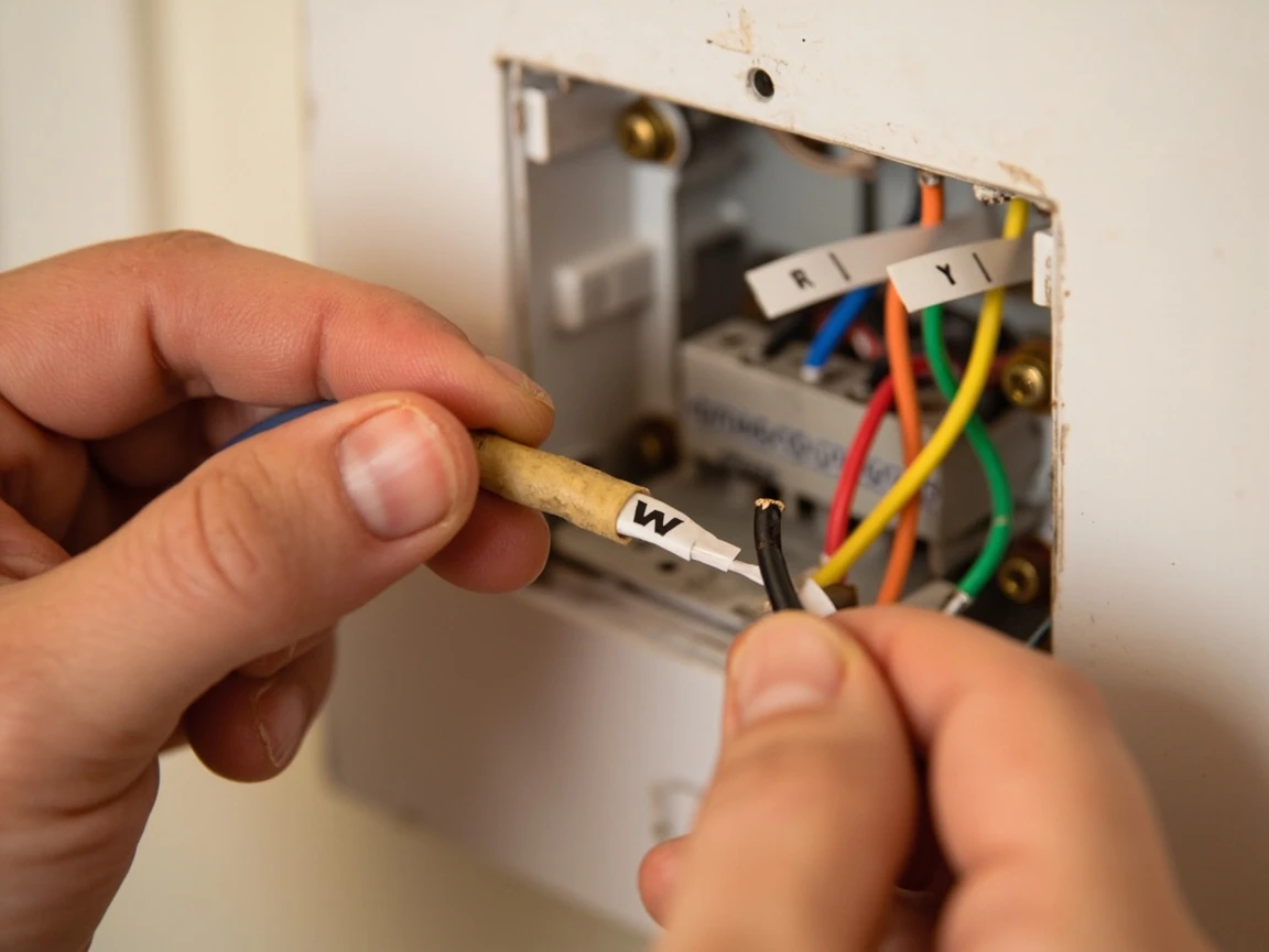 Using the wire labels included with your new thermostat (small stickers marked R, W, Y, G, C, etc.), wrap the matching label around each wire before you disconnect it from the old terminal. Match the label to the terminal letter the wire is currently connected to — not the wire color, since wire colors are not standardized across HVAC installations. For example, if a white wire is connected to the "W" terminal, label it "W." If a blue wire is connected to the "Y" terminal, label it "Y." Once every wire is labeled, loosen the terminal screws and gently pull each wire free.