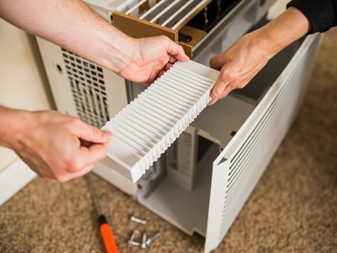 Before lifting the unit into the window, attach the accordion-style side panels (also called curtain panels) to the left and right sides of the AC housing. Slide each panel into its channel and secure it with the provided screws — most units have two screws per side. The panels will extend later to fill the gap between the unit and the window frame. If your unit came with foam strips for the top of the side panels, attach those now too.