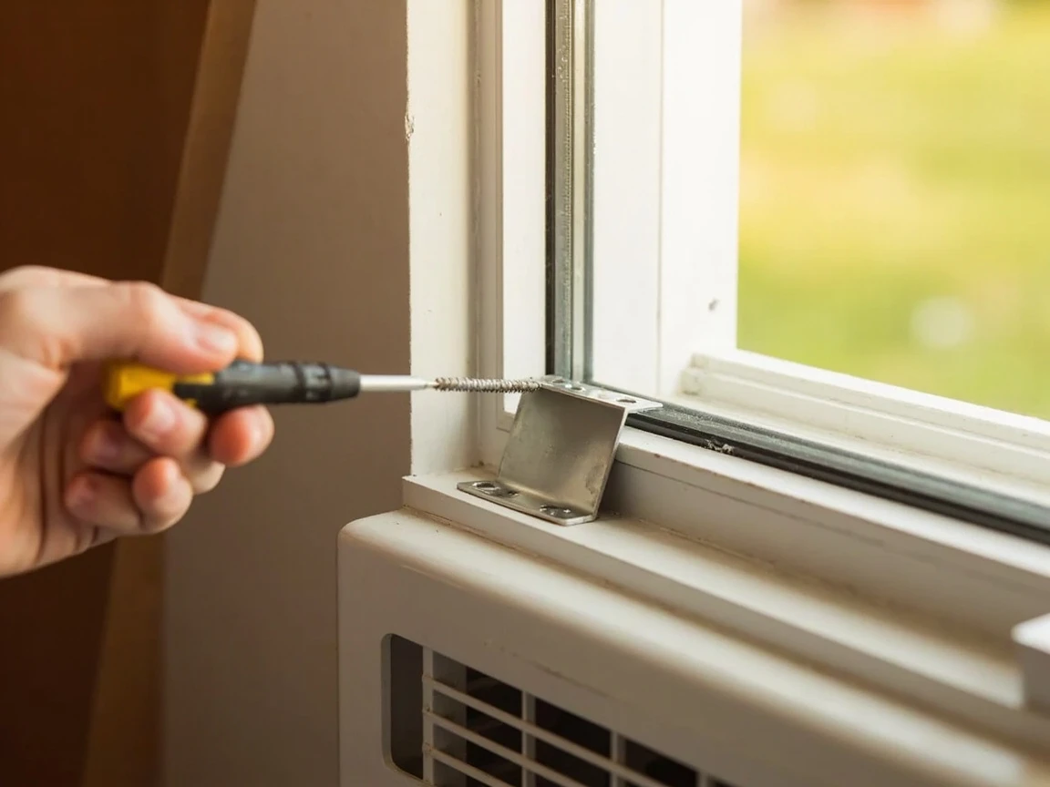 Your AC unit likely came with one or two small metal L-brackets and screws. These brackets lock the upper and lower window sashes together so the window can't be accidentally opened from outside (a security concern) and can't slide up off the unit. Position one bracket so it bridges the gap where the two sashes meet, drill a pilot hole through the bracket into the upper sash, and drive the provided screw. Do the same on the other side if two brackets are included. The sashes should now be firmly locked together.