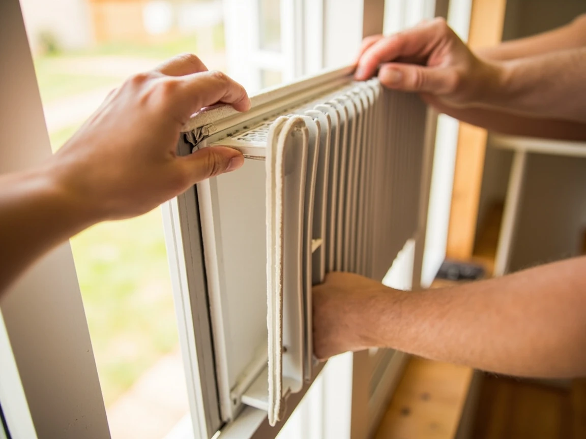 Pull the accordion side panels outward until they meet the window frame on each side, closing the gap completely. Secure each panel to the window frame with the provided screws — most panels have pre-drilled holes at the end. Then apply the foam weatherstrip along the top edge where the lower sash meets the upper sash's glass — cut it to length with scissors and press it firmly into the gap. This foam strip prevents warm outside air from leaking in around the top of the unit, which would make the AC work harder and waste energy.