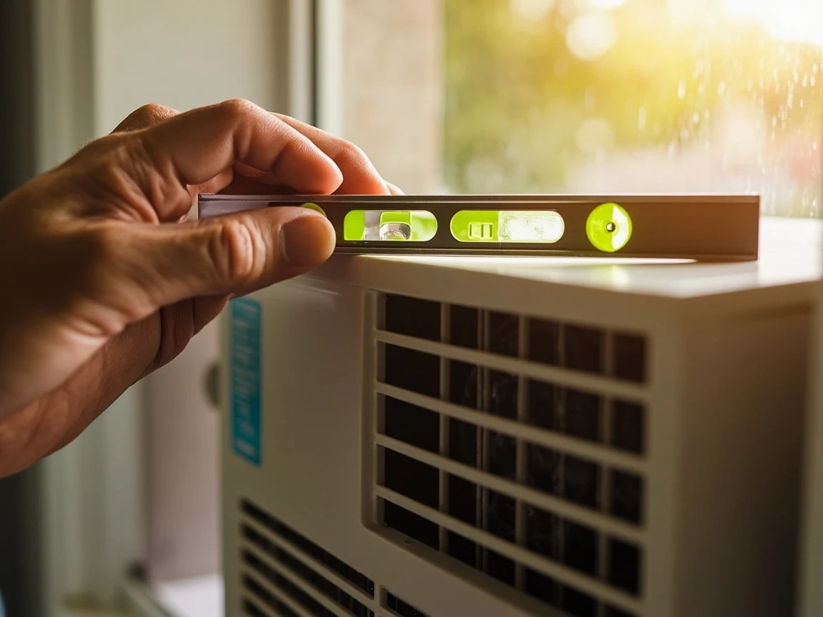 Place a torpedo level on the top of the AC unit from front to back. The unit should tilt very slightly toward the outside — about 1/4 inch lower in the back than the front. This slight slope ensures that condensation drains out the back of the unit instead of pooling inside or dripping into your room. If the unit is perfectly level or tilts inward, shim the front edge with thin wood shims between the unit and the windowsill until you achieve the correct slope. Check the drain hole or channel on the back of the unit to confirm it's not blocked.
