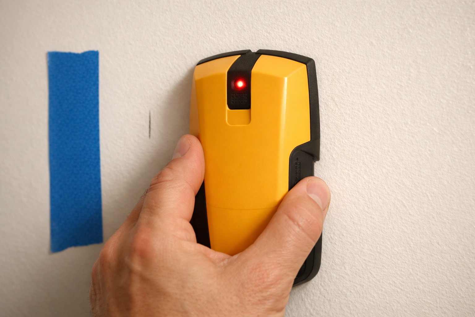 To verify a stud location, drive a thin finish nail at an angle through the drywall at your pencil mark. If it hits solid wood after 1/2 inch, you found the stud. If it punches through into open space, adjust your mark. The nail hole is tiny and easily patched.