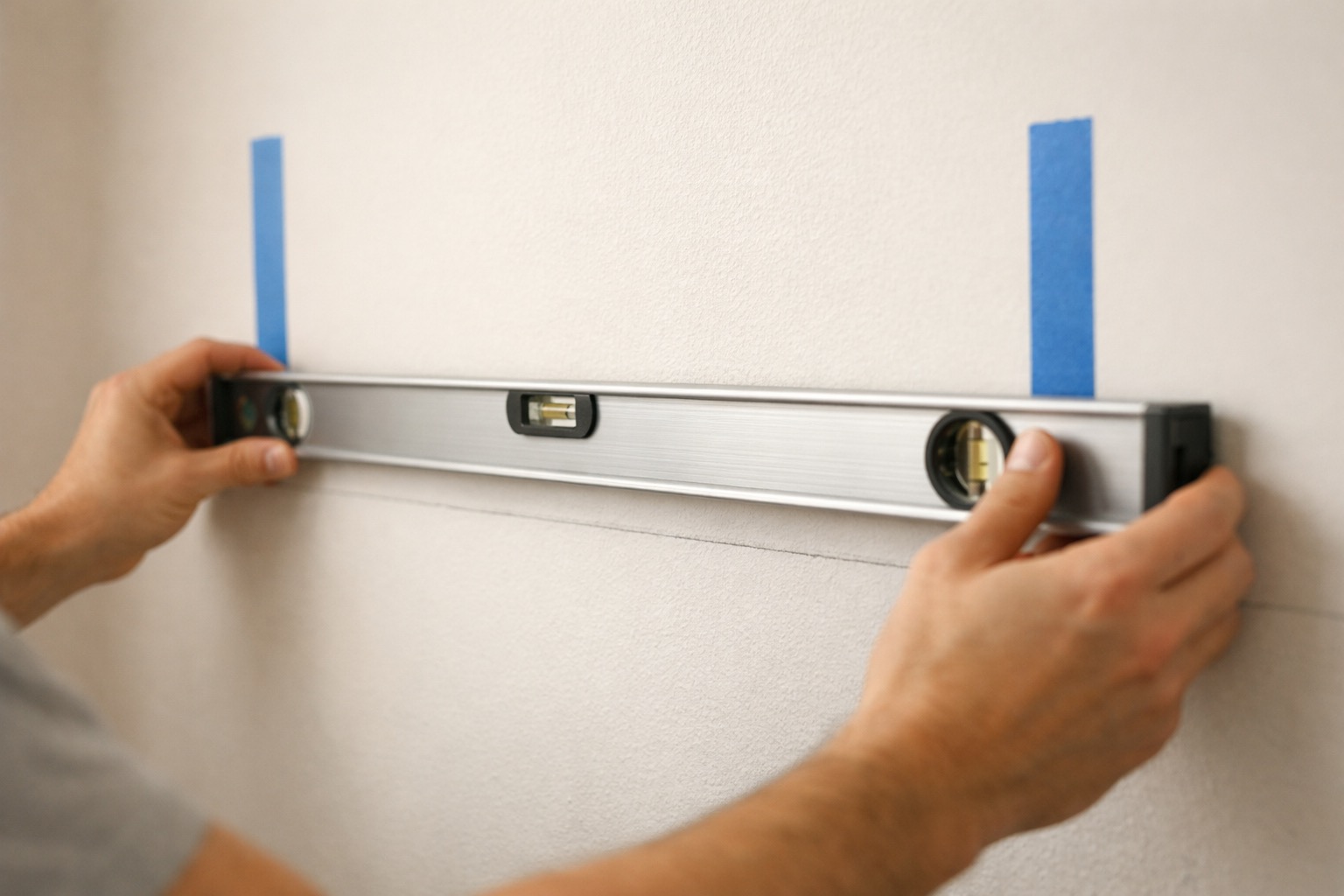 Decide where you want the shelf — common heights are 48 inches above the floor for a single display shelf, or 12-16 inches apart for stacked shelves. Measure up from the floor at one stud location and make a pencil mark at your desired height. Hold a 4-foot level against the wall with one end on your pencil mark and draw a faint, level line across to the next stud. This line represents the top edge of your mounting bracket.