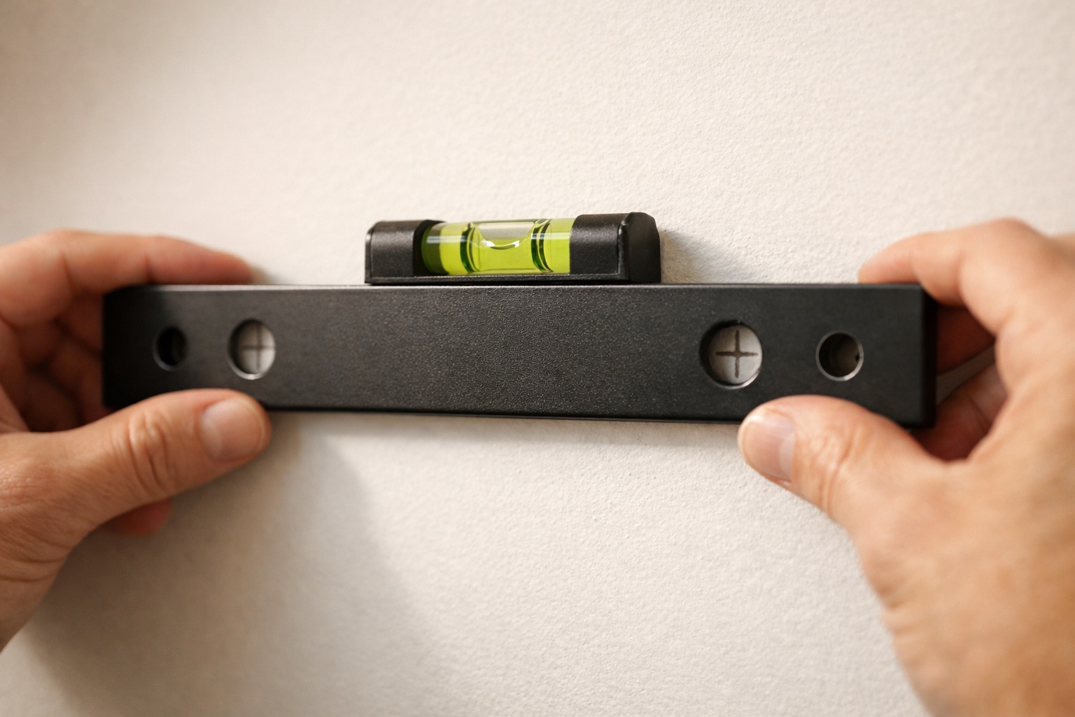 If you're installing multiple shelves at the same height (like flanking a TV), measure from the ceiling down rather than from the floor up — ceilings are more likely to be level than floors, so the shelves will look even to the eye.