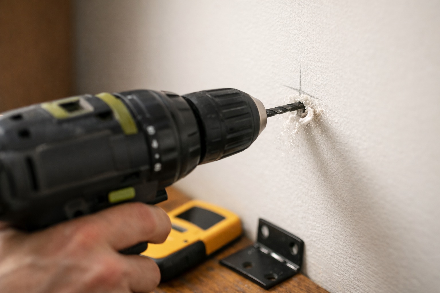 Set the bracket aside and drill a pilot hole at each marked screw location using a 3/32-inch drill bit. For holes going into studs, drill about 2 inches deep — you'll feel steady resistance as the bit bites into the solid wood behind the drywall. If a screw hole doesn't land on a stud, drill a larger hole (sized for your wall anchor) and install a heavy-duty toggle bolt or snap toggle rated for at least 50 pounds. Blow or vacuum the dust from each hole.