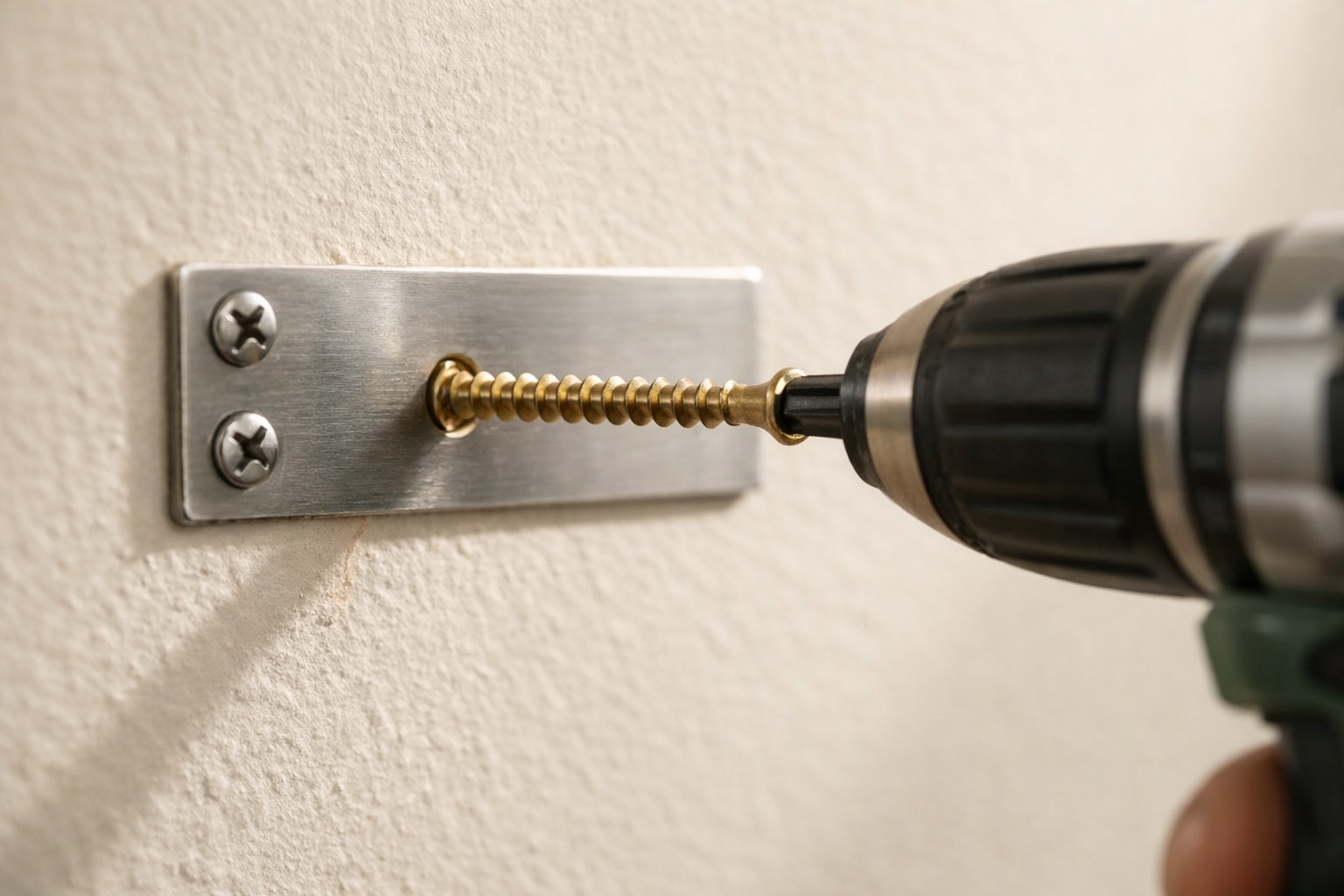Hold the bracket back up to the wall, align the screw holes with the pilot holes, and drive the provided #12 x 2-1/2-inch screws into each stud using a drill/driver. Tighten until the bracket is firmly clamped against the drywall with no play — but don't overtighten, as this can strip the wood or crack the drywall. For any anchor points, follow the anchor manufacturer's instructions to set the toggle before tightening the screw. Place a level on the bracket one final time and confirm it's perfectly horizontal before proceeding.