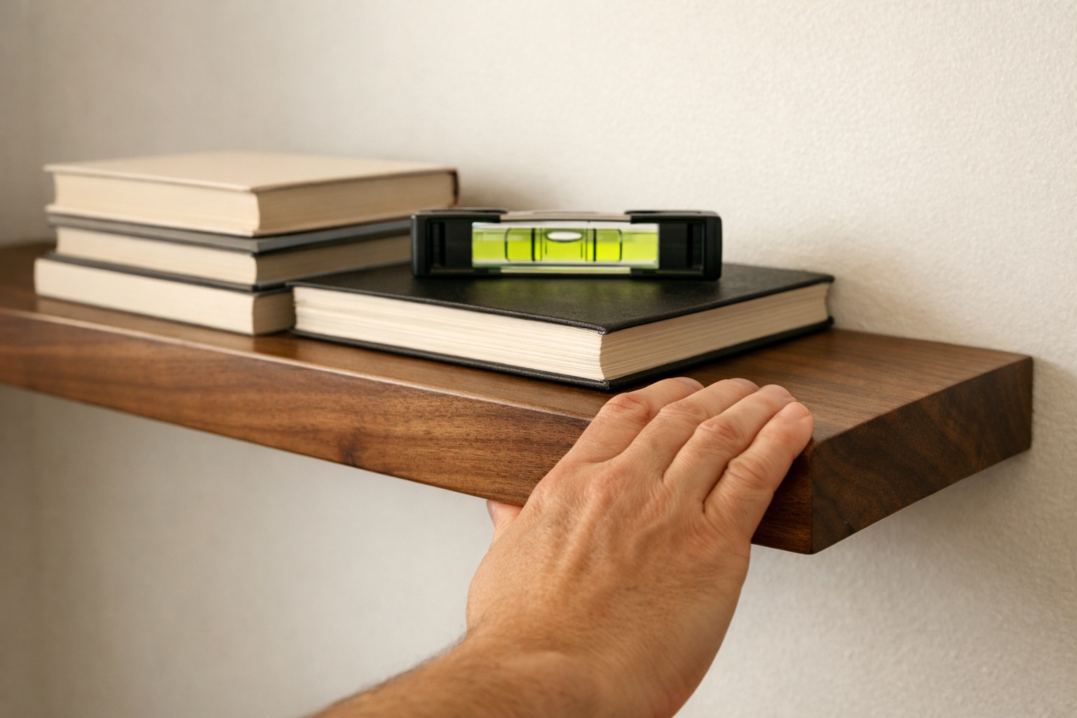 Firmly press down on the front edge of the shelf with both hands — there should be zero wobble or tilt. If the shelf dips when you push, a screw may have missed the stud or an anchor isn't holding. Place a stack of books or a gallon jug of water (about 8 pounds) on the shelf and leave it for 30 minutes, then check for any sagging with your level. A properly mounted shelf on two studs can hold 45-50 pounds per stud. Only load the shelf to its rated capacity once you've confirmed it's solid.