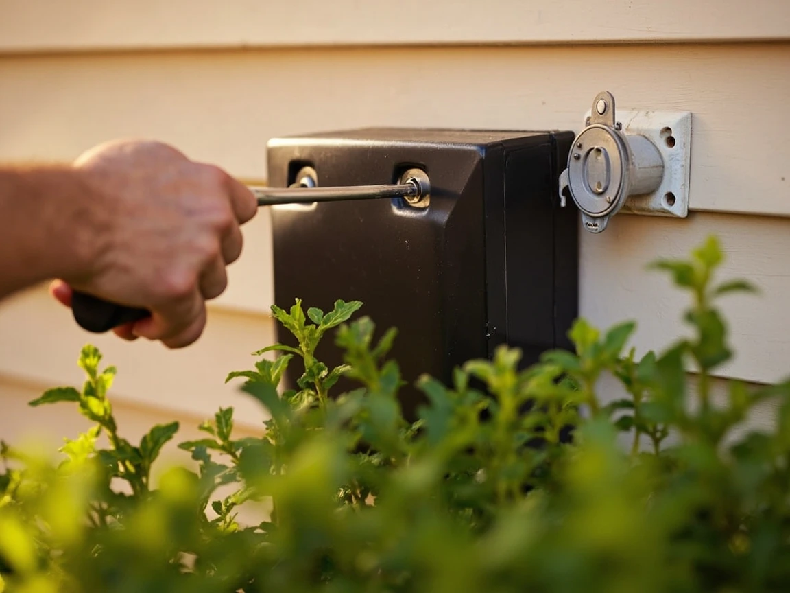 Choose a location for the transformer that's close to a GFCI-protected outdoor outlet and hidden from view — behind a shrub, under a deck, or on the side of the house. Mount it at least 12 inches above grade to keep it away from standing water and splashing. Most transformers have a built-in mounting bracket with keyhole slots — drive two screws into the wall stud or use masonry anchors on brick, hang the transformer, and tighten. Do not plug it in yet.