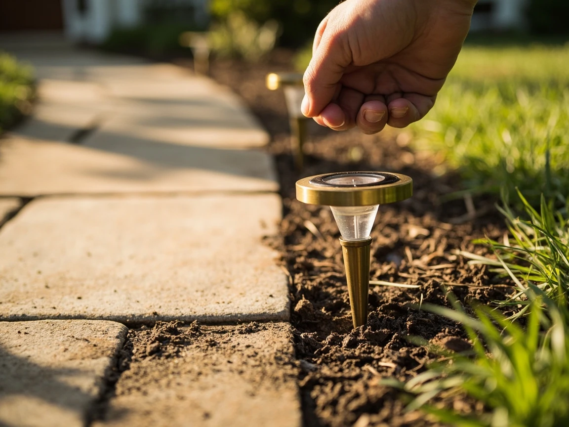 Set each fixture at its planned location and push the ground stake into the soil by hand or with a rubber mallet. Path lights should sit 14-18 inches above grade and be spaced 8-10 feet apart along walkways for even coverage without hot spots. Spotlights aimed at trees or walls should be positioned 1-2 feet from the base of the object being lit, angled upward at roughly 30-45 degrees. Step back after placing each fixture and check the sight lines — you want to see the light effect, not the fixture itself.