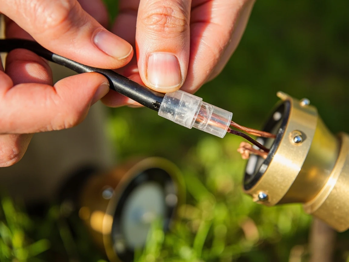 Most low-voltage landscape fixtures connect to the main wire using either snap-on piercing connectors (included with many kits) or waterproof gel-filled splice connectors. For gel connectors — the more reliable option — strip half an inch of insulation from each conductor on the main wire and from the fixture lead, insert all wires into the connector, and snap the lid shut. The gel displaces moisture and creates a weatherproof seal. Repeat for every fixture on the run. There is no polarity with 12V AC landscape wire, so it doesn't matter which conductor connects to which fixture lead.