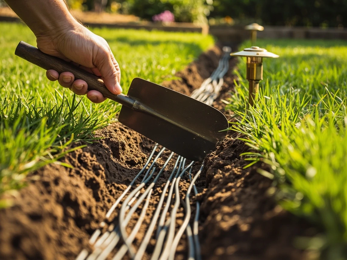 Once you're satisfied with fixture placement and voltage, use a flat-blade spade to cut a narrow trench 4-6 inches deep along each wire run. In lawn areas, slice straight down, fold the sod flap back, lay the wire in the bottom of the trench, and fold the sod back over — the grass will heal in a week or two. In mulched beds, simply tuck the wire under 3-4 inches of mulch. Where the wire crosses a paved walkway, run it underneath through a shallow trench dug at the edge, or through a piece of PVC conduit slipped under the pavement. Backfill the trenches and tamp the soil lightly.