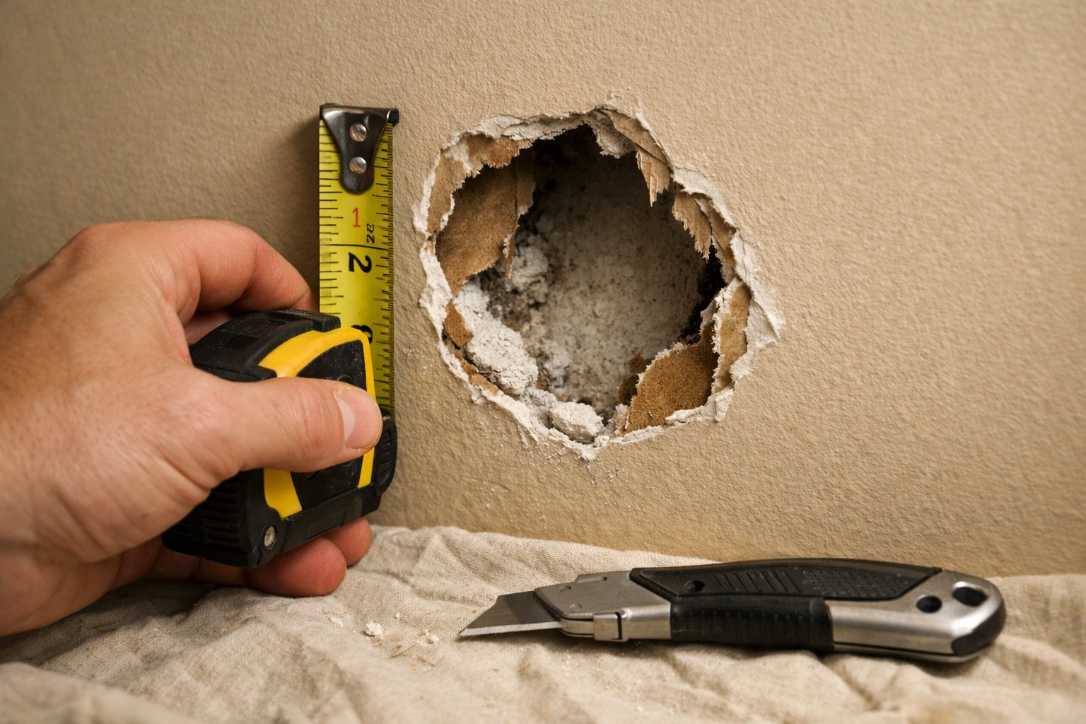 Measure the hole at its widest point. Nail holes and small dings under 1/2 inch need only spackle and a putty knife — skip to step 3. Holes from 1/2 inch to about 4 inches use a self-adhesive mesh patch. Anything larger than 4 inches requires a drywall cutout and backing board. Lay a drop cloth below the work area to catch dust and compound drips. If the hole has ragged edges, use a utility knife to trim any loose paper or crumbling gypsum so you have a clean, stable edge to work from.