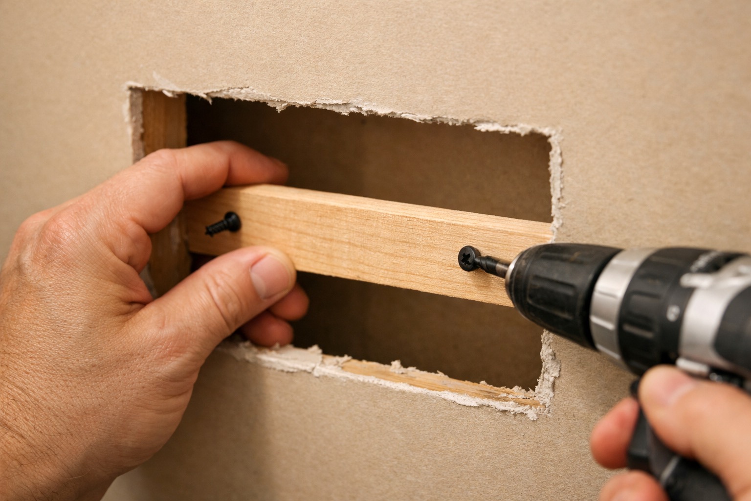 For holes larger than 4 inches, you need a solid surface behind the patch for the drywall screws to grip. Use a drywall saw to square off the hole into a clean rectangle — straight edges make the patch easier to fit. Cut a 1x3 furring strip about 4 inches longer than the hole's height. Slide the strip through the hole, center it behind the opening so it overlaps the existing drywall on both sides, and drive 1-1/4-inch drywall screws through the face of the wall into each end of the strip to anchor it. Cut a piece of scrap drywall to fit the rectangular opening and screw it to the backer strip, spacing screws every 6 inches.
