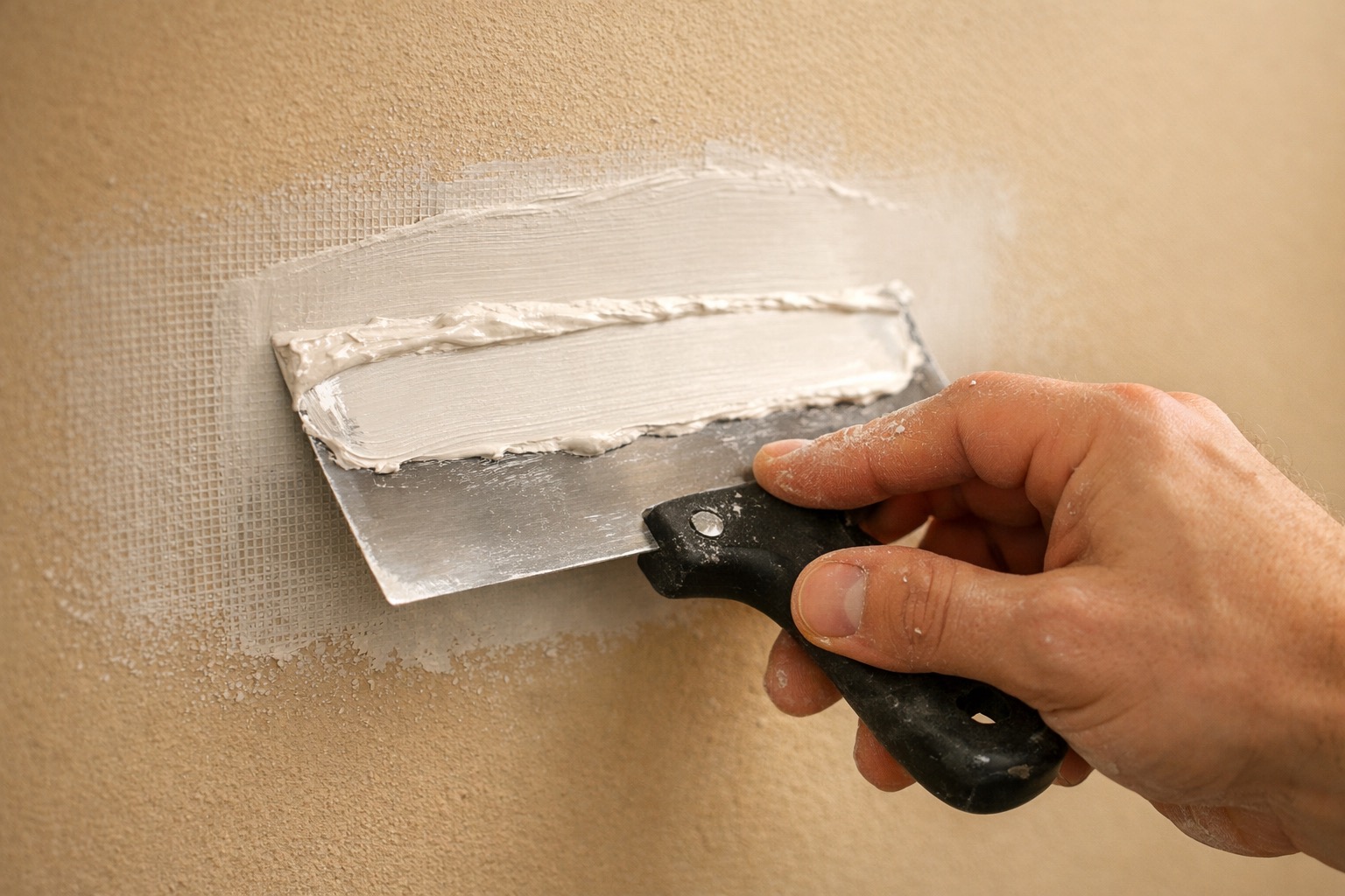 Load your 6-inch drywall knife with a thin layer of joint compound (or spackle for nail holes). Spread it over the patch in a crisscross pattern — first horizontally, then vertically — pressing firmly to embed the compound into the mesh. Feather the edges by increasing the angle of the knife as you reach the outer edges, blending the compound into the surrounding wall so there's no hard ridge. The first coat should be thin — you're filling the mesh texture and covering the tape, not building up thickness. Let it dry completely — lightweight compound typically takes 1-2 hours, but check the manufacturer's instructions.