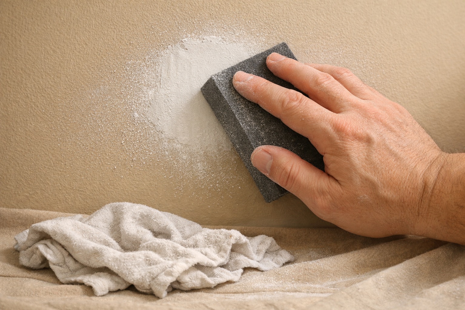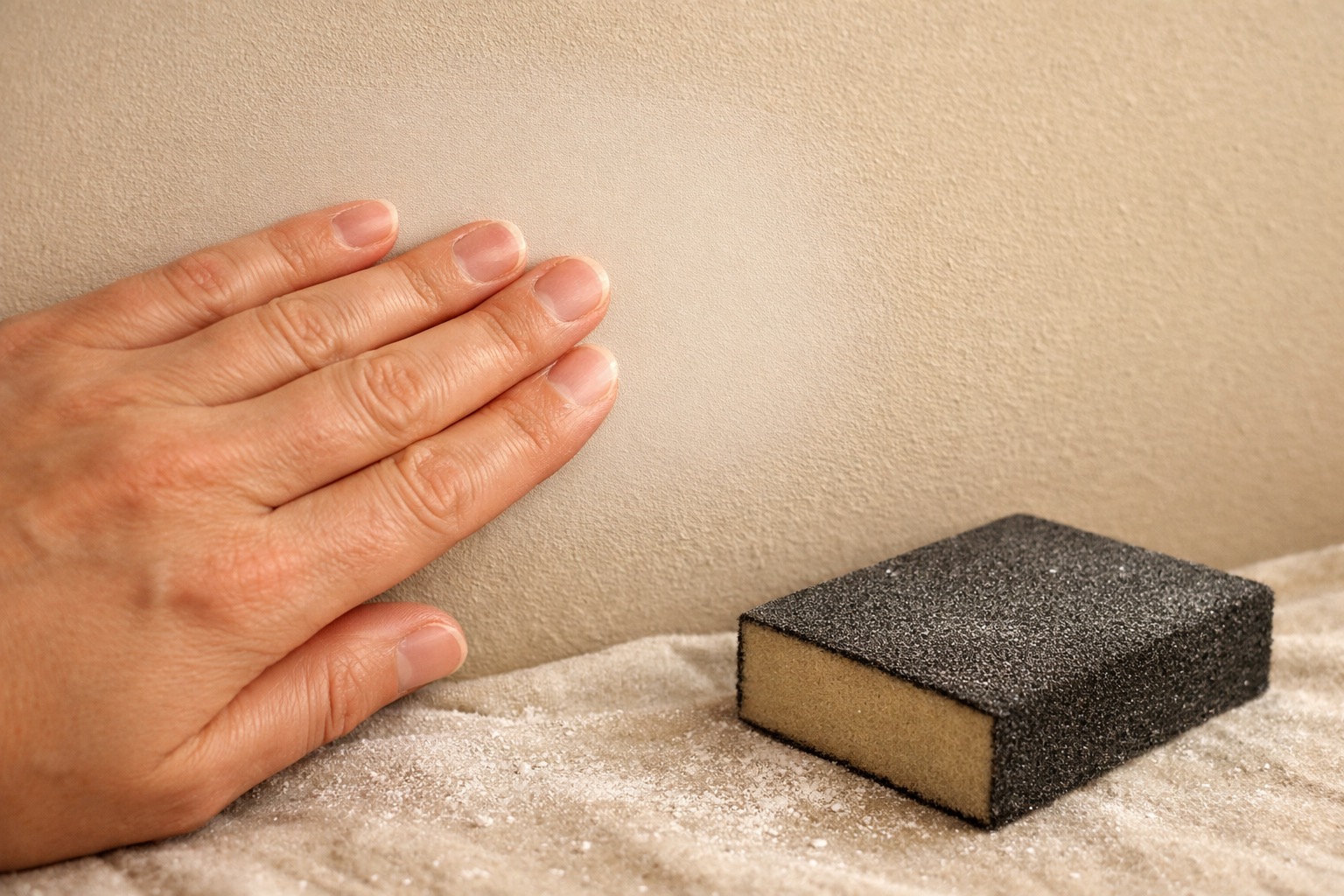 Once the skim coat is fully dry, do a final sand with 150-grit sandpaper or a fine sanding sponge. Sand in light, circular motions, blending the edges of the patch into the surrounding wall until you can't feel where the repair ends and the original wall begins. Wipe the entire area with a damp (not wet) rag or tack cloth to remove all dust. Run your hand over the surface one more time to check for smoothness. The repair area should feel identical to the untouched wall around it.