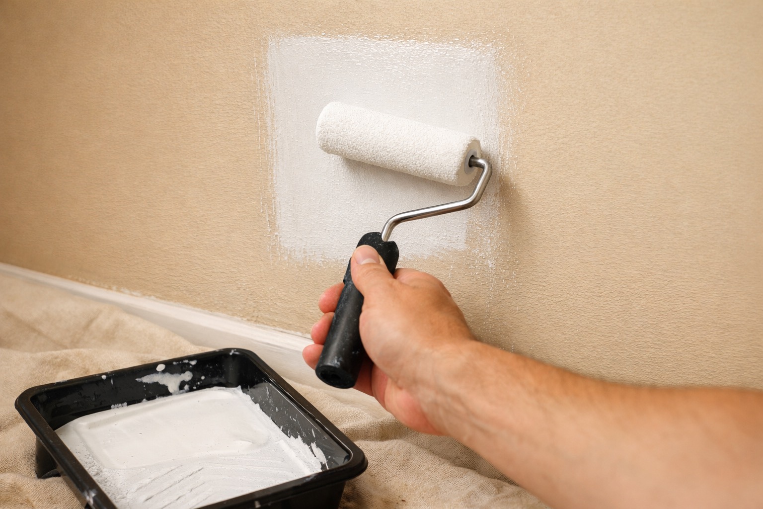 Apply a coat of PVA drywall primer or all-purpose primer over the entire repaired area, extending about 2 inches beyond the outer edges of the compound. Primer seals the porous joint compound so it absorbs paint at the same rate as the surrounding wall — without primer, the patch will show through as a dull, flat spot called "flashing." Let the primer dry (usually 30-60 minutes), then apply touch-up paint with a small roller for the best texture match. For the most invisible result, repaint the entire wall from corner to corner.