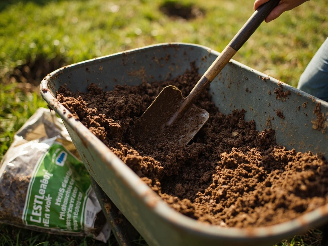 Mix your excavated soil with compost or aged manure at roughly a 1:1 ratio if your native soil is heavy clay or poor sandy loam — for average loamy soil, a 3:1 native-to-compost ratio is plenty. Add a handful of slow-release granular fertilizer formulated for evergreens or trees and shrubs, following the label rate. Do not add fresh manure (it burns roots) or pile up heavy amendments only in the hole — this creates a 'bathtub effect' where water collects and drowns the plant. Blend everything thoroughly in the wheelbarrow so the amended soil matches the surrounding ground.