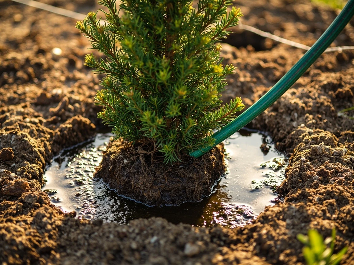 Shovel the amended soil back into the hole around the root ball, firming it gently with your hands (do not stomp it hard — compacted soil chokes roots). Fill to the top of the root ball, not above it. Once the hole is full, use your hands or a shovel to form a 3-inch-tall ring of soil around the edge of the root ball — this 'soil dam' or basin holds water directly over the roots instead of letting it run off. Slowly fill the basin with water from the hose until it pools, let it drain, then fill it a second time. This settles the soil and eliminates air pockets around the roots.