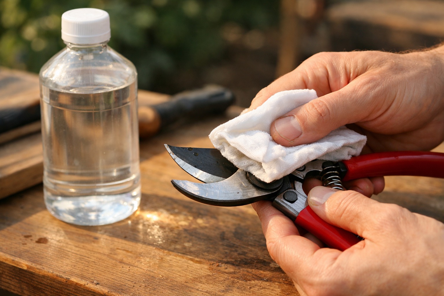Before starting (and between each tree), wipe all blade surfaces with a cloth soaked in 70% isopropyl alcohol. Fire blight and other fungal diseases spread on contaminated pruning tools. This simple step prevents inadvertently inoculating healthy wood when making cuts.