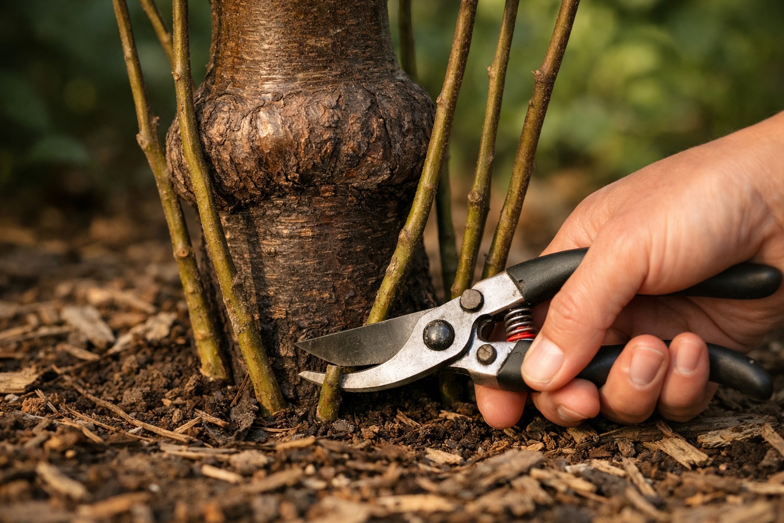 Suckers are vigorous vertical shoots growing from the rootstock at the tree's base (below the graft union — the slight bulge near the soil). Snip them flush at their base. Water sprouts are fast-growing vertical shoots that shoot straight up from established branches. They produce no fruit and block light from entering the canopy.