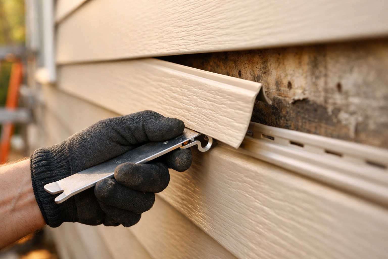 You will need: Vinyl siding zip tool (unlocking tool), Tape measure, Utility knife with fresh blade, Tin snips or aviation snips, Hammer, Flat pry bar, Caulking gun, Chalk line, Safety glasses. Materials include: Replacement vinyl siding panel (matching profile and color), 1-1/2-inch galvanized roofing nails, Exterior-grade waterproof caulk (color-matched or paintable), Exterior spackle or vinyl patch filler (for small holes), 220-grit sandpaper, Clean microfiber cloths.