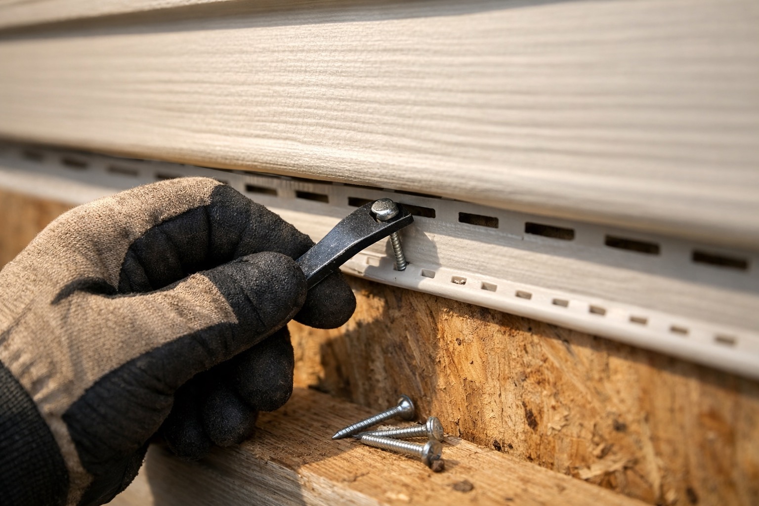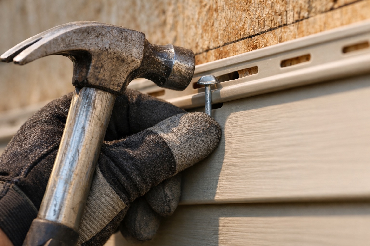 Never nail tight — vinyl expands and contracts up to 1/2 inch over a 12-foot panel with temperature changes. Tight nails cause buckling and warping that's obvious and expensive to fix.