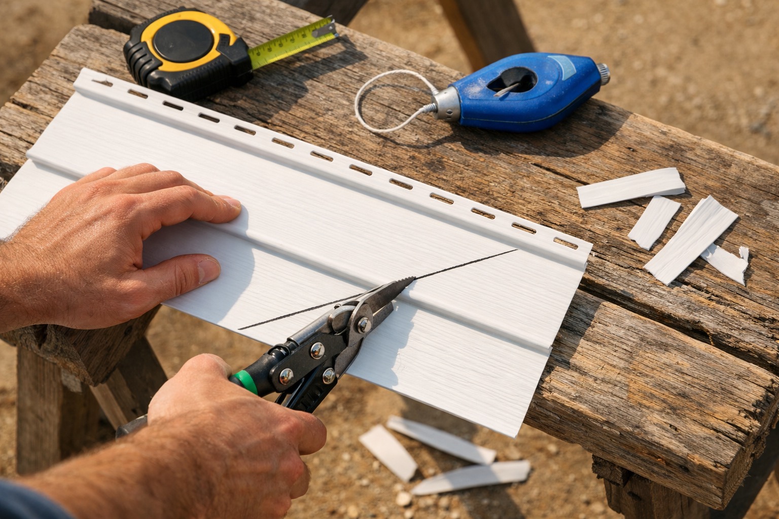 Measure the length of the opening and add 2 inches on each side for overlap — vinyl panels need room to slide past their neighbors for a weathertight joint. Transfer the measurement to the replacement panel and mark a cut line with a chalk line or straight edge. Cut with tin snips for short cuts (under 12 inches) or score-and-snap with a utility knife for full-length cuts: score the face deeply along your mark, bend the panel away from the score, and it will snap cleanly. For the nailing strip end, use tin snips to cut the slots.