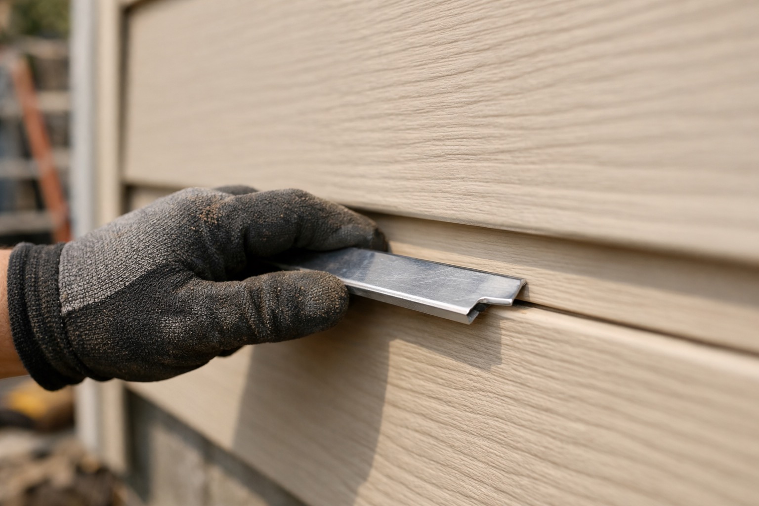 Work on a warm afternoon if possible — vinyl above 60°F is flexible and locks together easily. In cold weather, the panels are stiff and the lock can resist snapping shut.