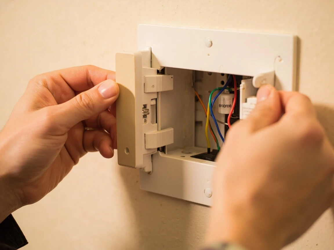 If your new thermostat requires batteries, install them now before snapping on the faceplate. Align the faceplate with the wall plate and press firmly until it clicks into place — most models snap on from the top and pivot down, or push straight on. Confirm it sits flush against the wall with no wobble or gaps. If it doesn't seat properly, a wire may be pushing the plate out — open it back up and tuck any excess wire neatly into the wall cavity.