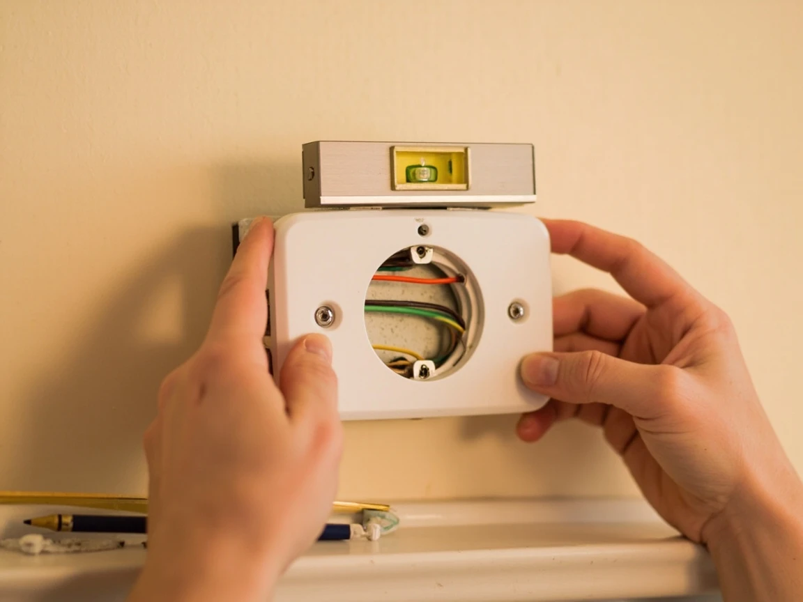 Thread the labeled wires through the wire opening on the new wall plate. Hold the plate against the wall, place a small torpedo level on top, and adjust until it's perfectly level. Mark the screw hole locations with a pencil. If the old mounting holes don't align, drill new holes using a 3/16-inch bit and insert the provided wall anchors. Secure the wall plate with the included screws — snug them firmly but don't overtighten, which can crack the plastic.