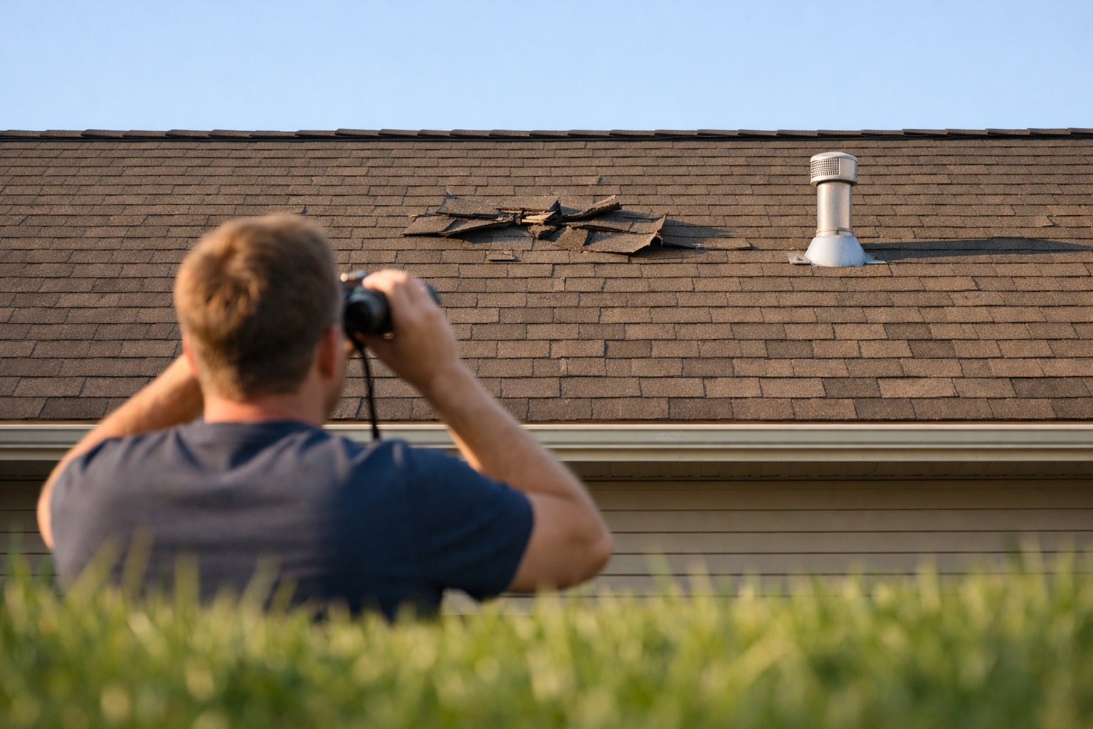 Before climbing up, use binoculars to scan the roof from the ground and identify which shingles are damaged. Look for curling edges, visible cracks, missing tabs, or dark exposed patches where granules have worn away. Note the location relative to landmarks like vents, chimneys, or valleys so you can find the spot quickly once you're on the roof. Check the weather forecast — you need a dry, calm day between 50-80°F for the best results.