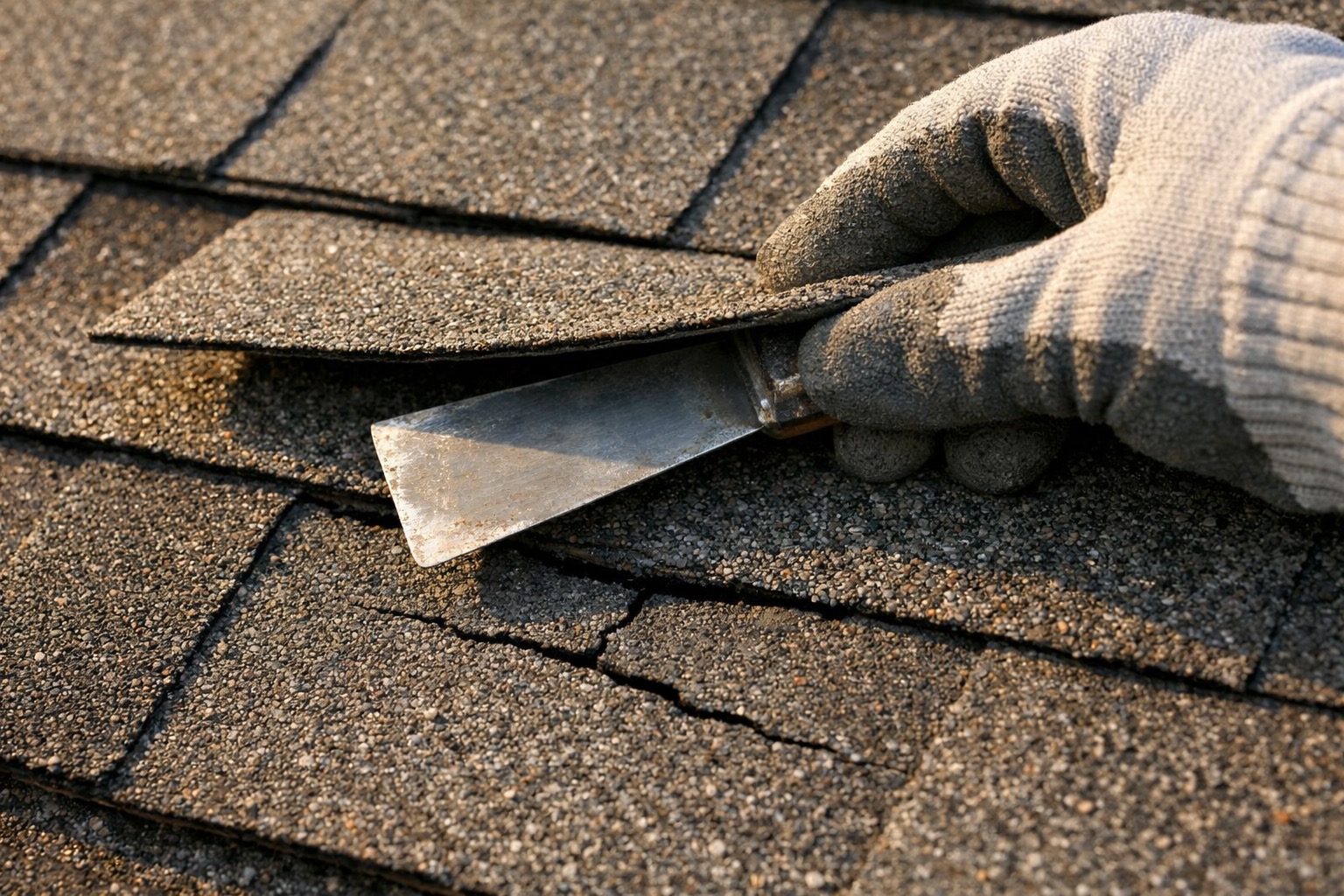 If it's a warm day and the sealant is very sticky, work in the early morning when the roof is cooler and the adhesive is firmer. In cold weather, be extra gentle — cold shingles are brittle and crack easily.