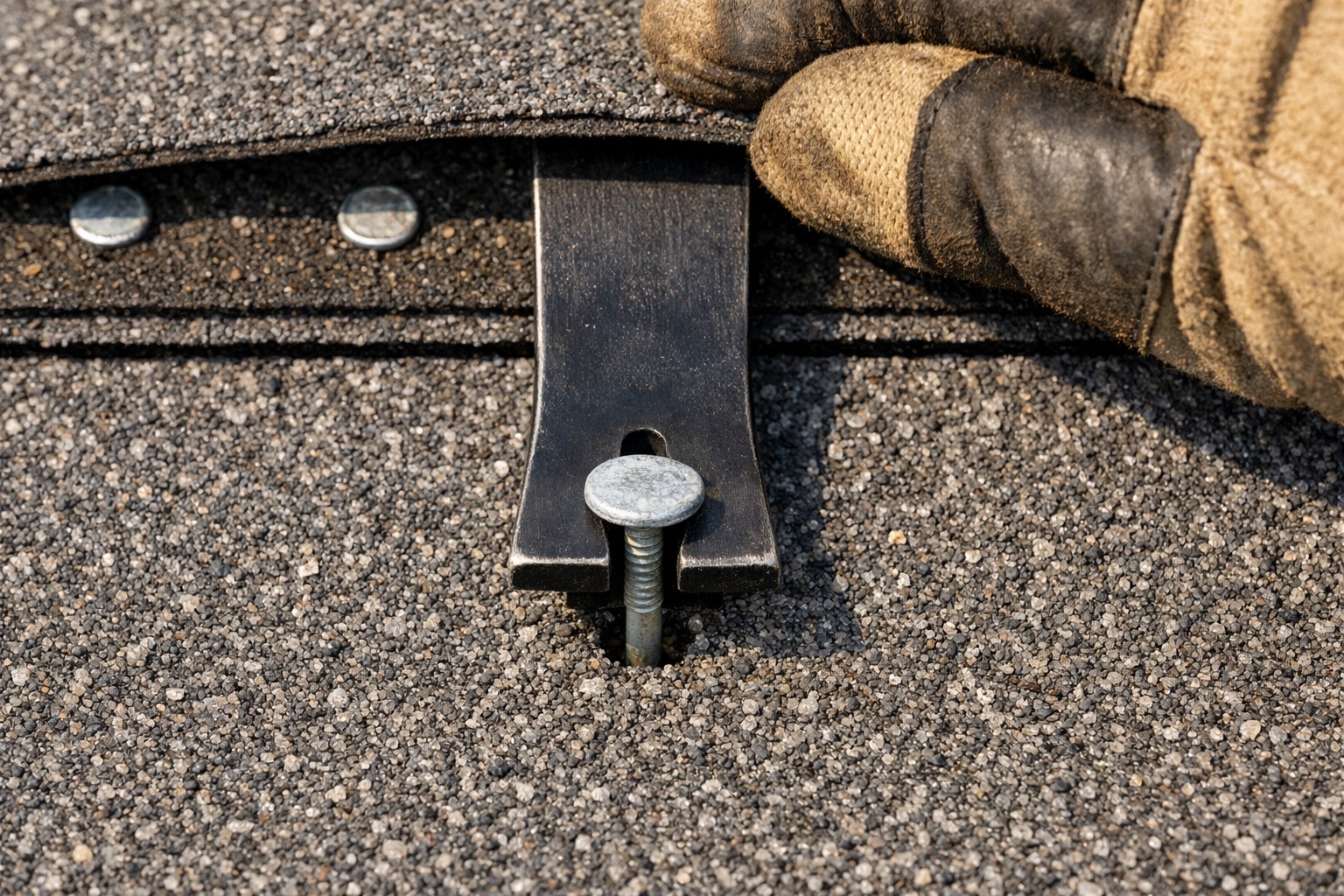 Do not pry nails sideways — this tears the surrounding shingles and creates new damage. If a nail won't pull cleanly, tap the pry bar under the head with your hammer and lever it straight up.