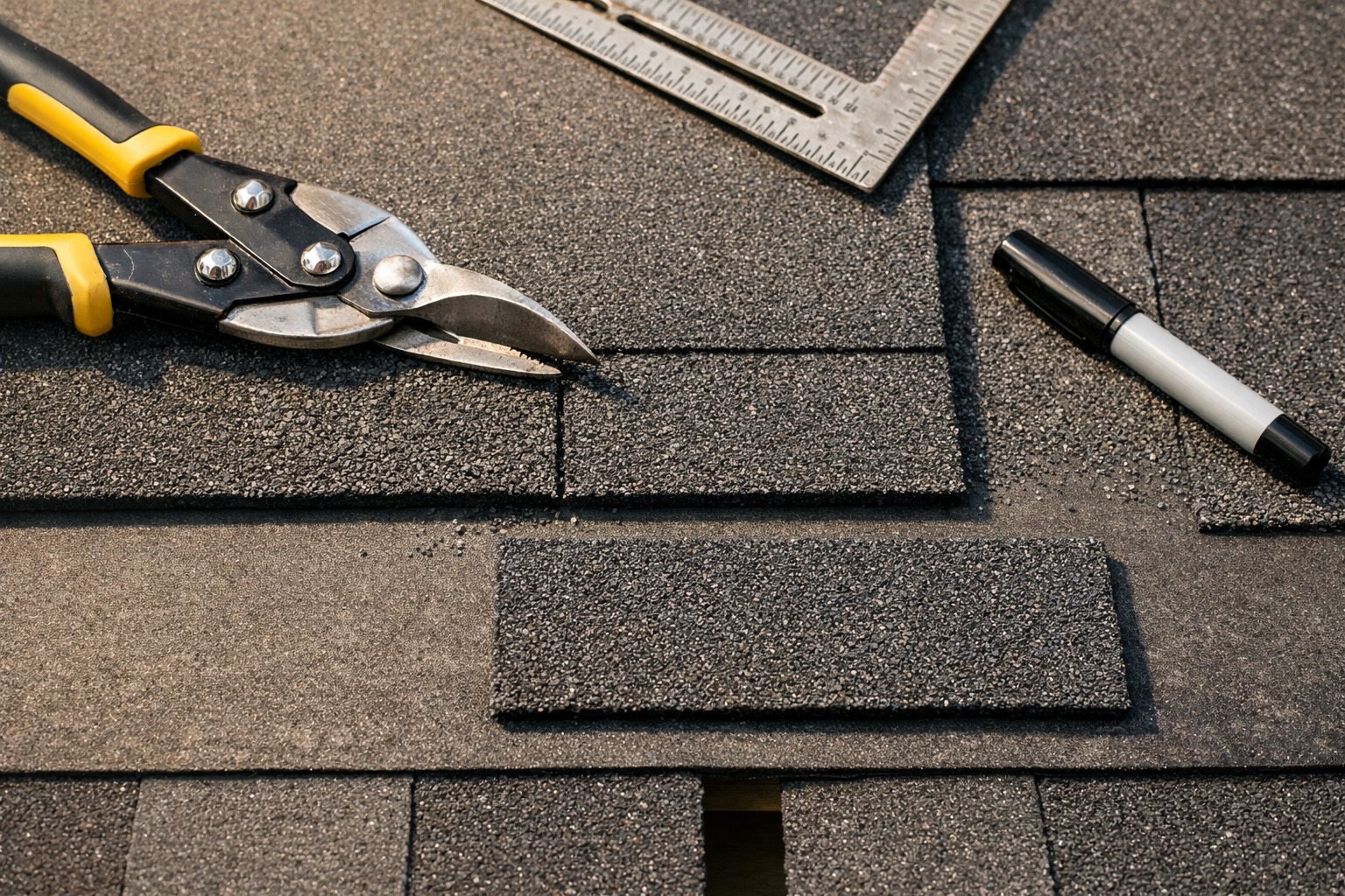 Place the replacement shingle next to the gap and mark it with a permanent marker and carpenter's square if it needs trimming. Cut with tin snips for a clean, straight edge. The replacement should be the same width as the gap or about 1/4 inch narrower to slide in easily. If you're lucky enough to have leftover shingles from the original roof installation, use those — they'll be an exact color match. New shingles from the same manufacturer and product line will be close but may look slightly different until they weather.